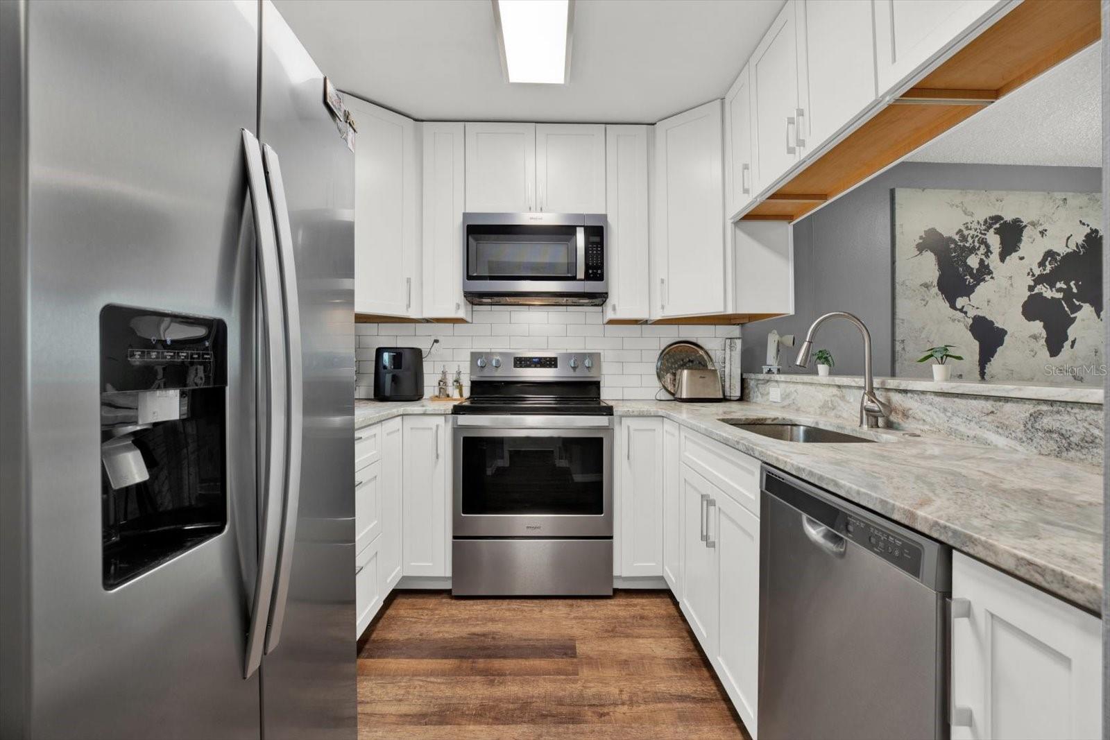 Completely renovated top to bottom in 2022, this bright and open unit features updated kitchen with leathered granite countertops and stainless-steel appliances, updated bathroom, flooring, windows, sliding glass door, and new washer and dryer.
