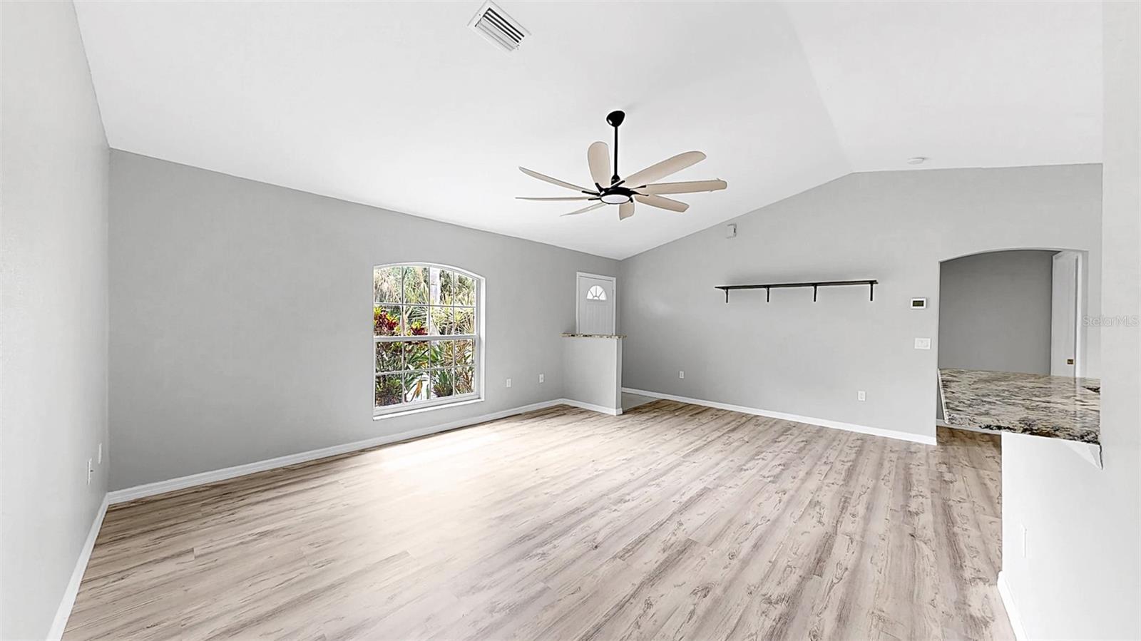 - Interior Features: Ceiling Fans(s), High Ceilings, Living Room/Dining Room Combo, Open Floorplan, Primary Bedroom Main Floor, Stone Counters, Vaulted Ceiling(s), Walk-In Closet(s)