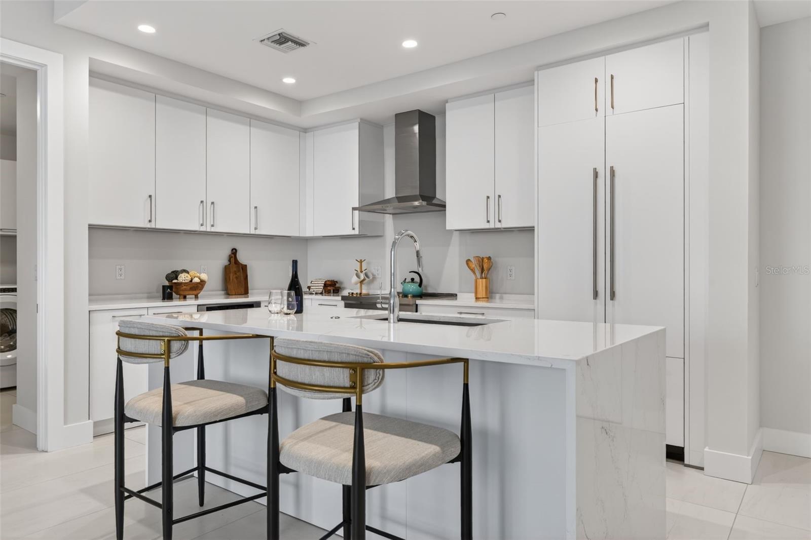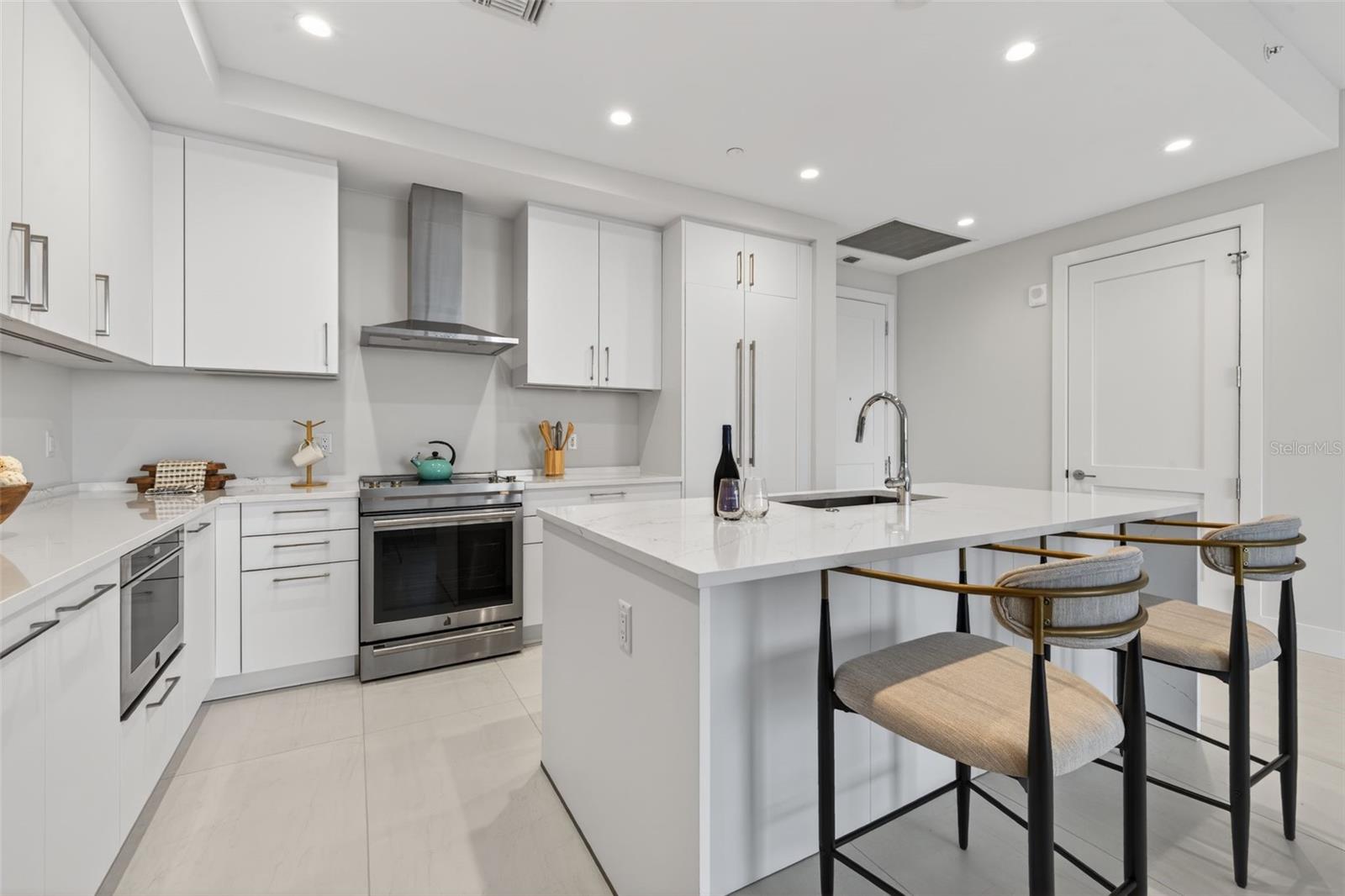 One or more photo(s) has been virtually staged. Welcome to Art House in Downtown St. Petersburg. This Harmony floorplan offers 1,339 square feet with 2 bedrooms, 2.5 baths, and a 308 square foot private terrace that truly extends your living space outdoors. The West facing exposure brings in great natural light and beautiful Florida sunset views with distant water and skyline scenery. The open layout includes a split bedroom design and a modern kitchen with European style cabinetry, quartz countertops, a waterfall edge island, JennAir stainless steel appliances including induction cooktop, built in refrigeration, wall oven, microwave drawer, paneled dishwasher, and exterior vented hood. Finishes include Grohe fixtures and recessed LED lighting for a clean, contemporary feel. Residents enjoy an impressive collection of amenities including a state of the art fitness center, yoga and training studios, sauna and steam rooms, a resort style pool terrace, pool table lounge area with game simulator, movie room, coworking space, and a covered dog park. Located just two blocks from the waterfront parks and Beach Drive, with easy access to dining, shopping, galleries, and museums. This Harmony residence is move in ready and offers an elevated condo lifestyle with the bonus of incredible Florida sunsets.