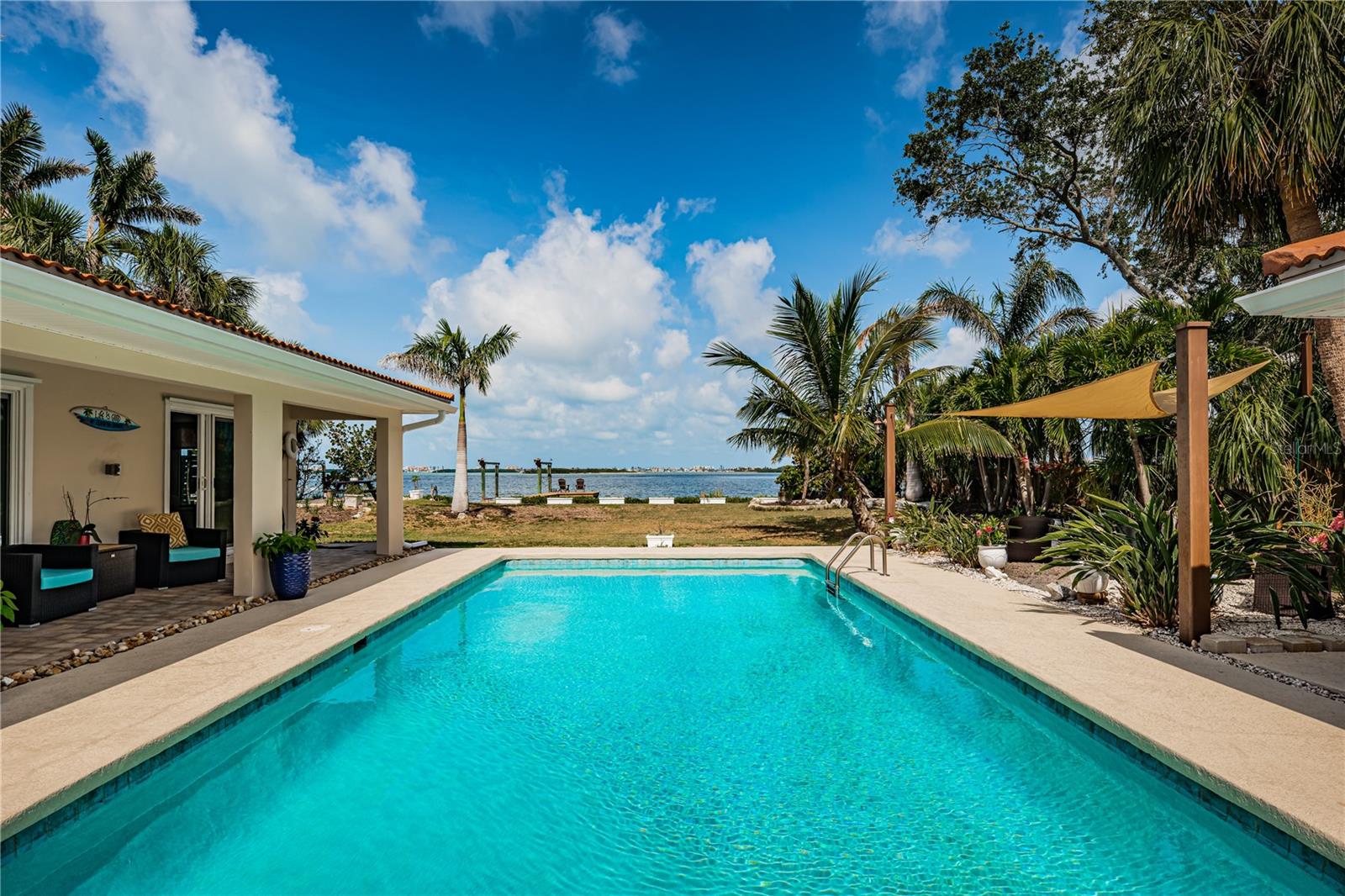 An entertainer’s dream, this waterfront haven offers the ultimate in outdoor living. The backyard is designed for relaxation and fun, featuring a sparkling saltwater pool and a spacious patio—partially covered to ensure year-round enjoyment. A charming, landscaped picnic area guides you to the newly refurbished dock, complete with a permitted lift (not operable), offering seamless access to Boca Ciega Bay for boating and water activities. Lush greenery thrives with the help of a well-fed irrigation system, creating a vibrant coastal retreat. Adding to the privacy and exclusivity, the property benefits from a 40-ft-wide neighborhood water access along the north property line, ensuring peaceful separation from neighboring homes.