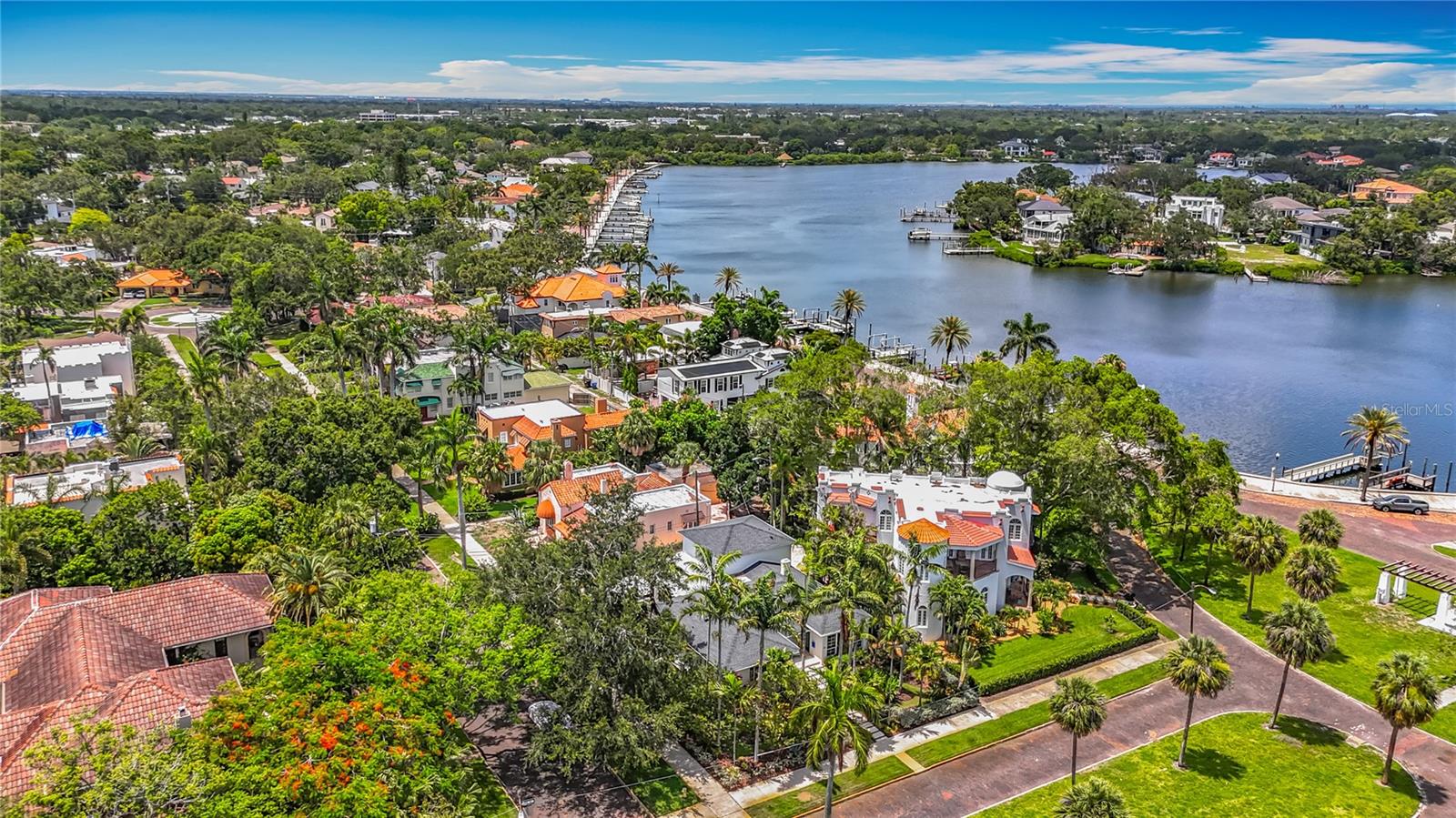 Immaculate and stunning Mid-Century Modern home in historic Granada Terrace. Great water view and because of it's high elevation it has never been affected by past storms or hurricanes. Granada Terrace Park has sweeping water views across Coffee Pot Bayou and is the perfect location that allows you to walk out the front door and watch manatee and dolphins frolicking, drop in a kayak, take a long walk along the water to downtown, fish off the steps that Perry Snell installed for gondola tours or simply enjoy the quiet peace of the park. The serene garden entrance leads up to coral steps and a perfect porch to people watch. At the entry, you will find an open floor plan with a cozy sitting area that has breathtaking views of the water and an occasional wedding, a living room, dining room and open kitchen with an eat-in bar. The kitchen cabinets go perfectly with the original wood flooring for a retro, yet modern aesthetic. A primary suite with a graciously appointed bathroom has views of the park and doors to a small outside sitting area that lead to the turfed backyard, pool and lanai. A resplendent retreat. The second bedroom, also with ensuite bath, is located downstairs and would make a great space for a family member or guest room. Past the kitchen are stairs leading up to the private second primary or guest room with a full ensuite bath. Adjacent to the kitchen is a den that has many uses. Movie watching, cozying up to a good book, a wonderful play area for the kids or working from the built in desk. The den has doors that lead out to the lanai and pool area. A half bath located in the den provides convenient access on a pool day. The covered lanai and pool are hidden by a beautifully lush bamboo hedge and privacy wall. The pebble pool and no maintenance turf is easy on the kids and revered by dogs everywhere. There is also plenty of room to store the kayaks and paddle boards. The driveway and carport are to the side maintaining that clean front yard aesthetic. A storage area with a garage door that could house your scooters or a motorcycle for the inevitable downtown adventures is a handy space with access to the laundry room. Lutron lighting for complete control and customization of whole house illumination. Hunter Douglas custom blinds that open up and down. Landscaping lighting. Surround sound. The brick lined streets, immediate access to the third largest urban waterfront park system in North America, walking distance to vibrant downtown St. Pete and a small boat launch at Crisp Park make this undeniably the spot to enjoy all that the historic Old NE area has to offer.