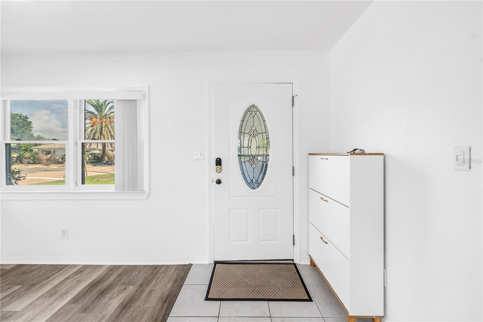 The kitchen is perfect for entertaining, with a peninsula offering bar seating, ample counter space, and generous storage. A nearby hallway leads to a convenient laundry closet and a modernized guest bathroom.