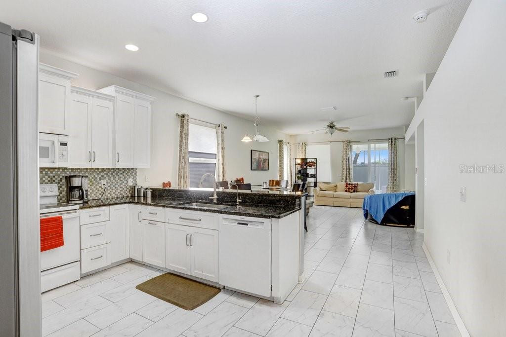 Welcome home to this well-maintained villa, ideally situated at the end of a peaceful cul-de-sac within the gated community of Longleaf - Meadow Point II. This spacious 3-bedroom, 2-bathroom home, complete with a versatile den/office, boasts an inviting open floor plan flooded with natural light. The heart of the home features a well-appointed kitchen overlooking the dining area and an oversized great room, perfect for entertaining. Sliders lead out to the extended, covered lanai, offering a serene space to relax and enjoy the Florida lifestyle.