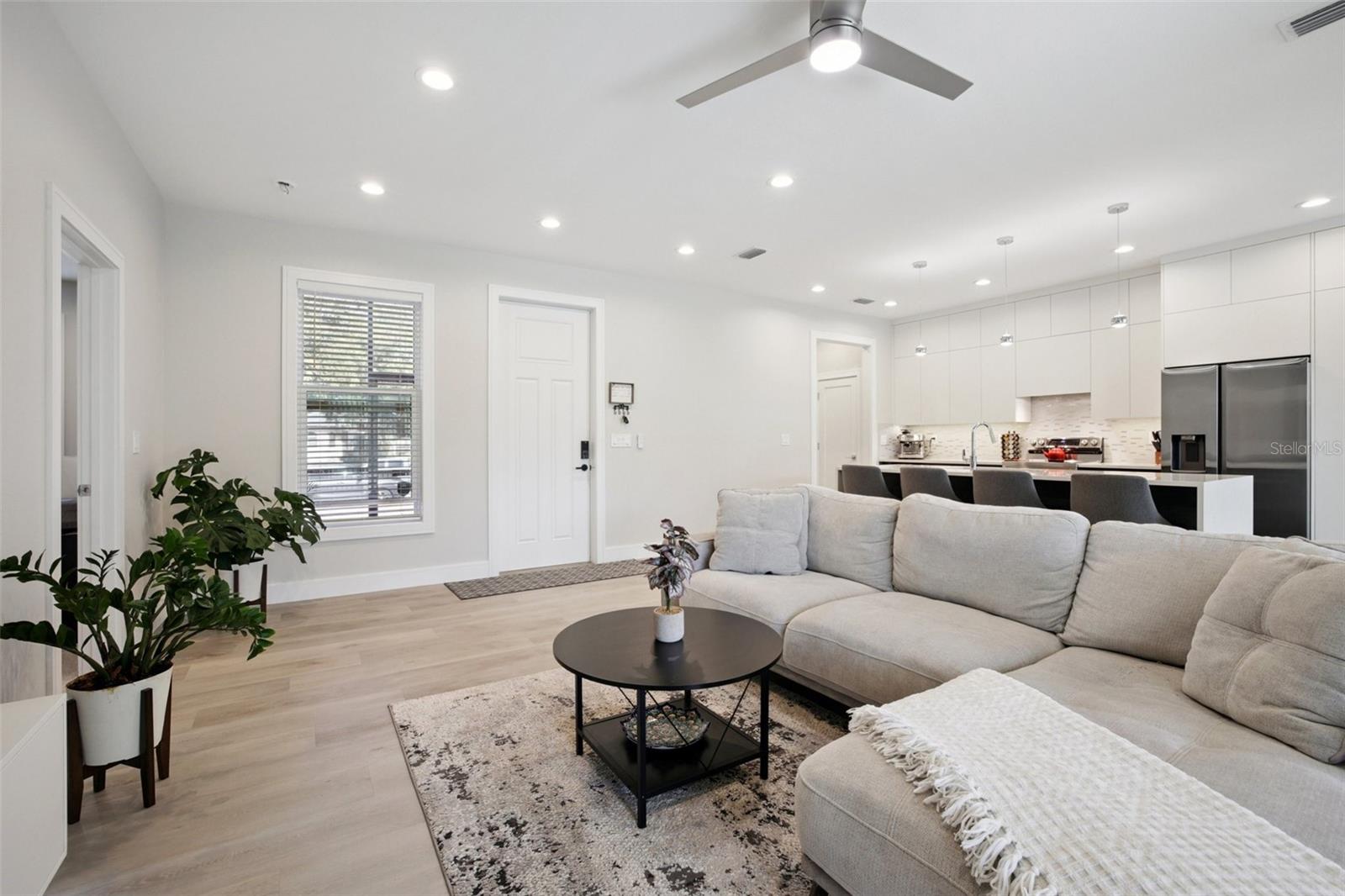 Inside, the open-concept layout creates an inviting atmosphere perfect for everyday living and entertaining. The kitchen serves as the centerpiece, showcasing a stunning waterfall quartz island, upgraded appliances, and seamless flow into the main living space highlighted by a custom built-in media wall.