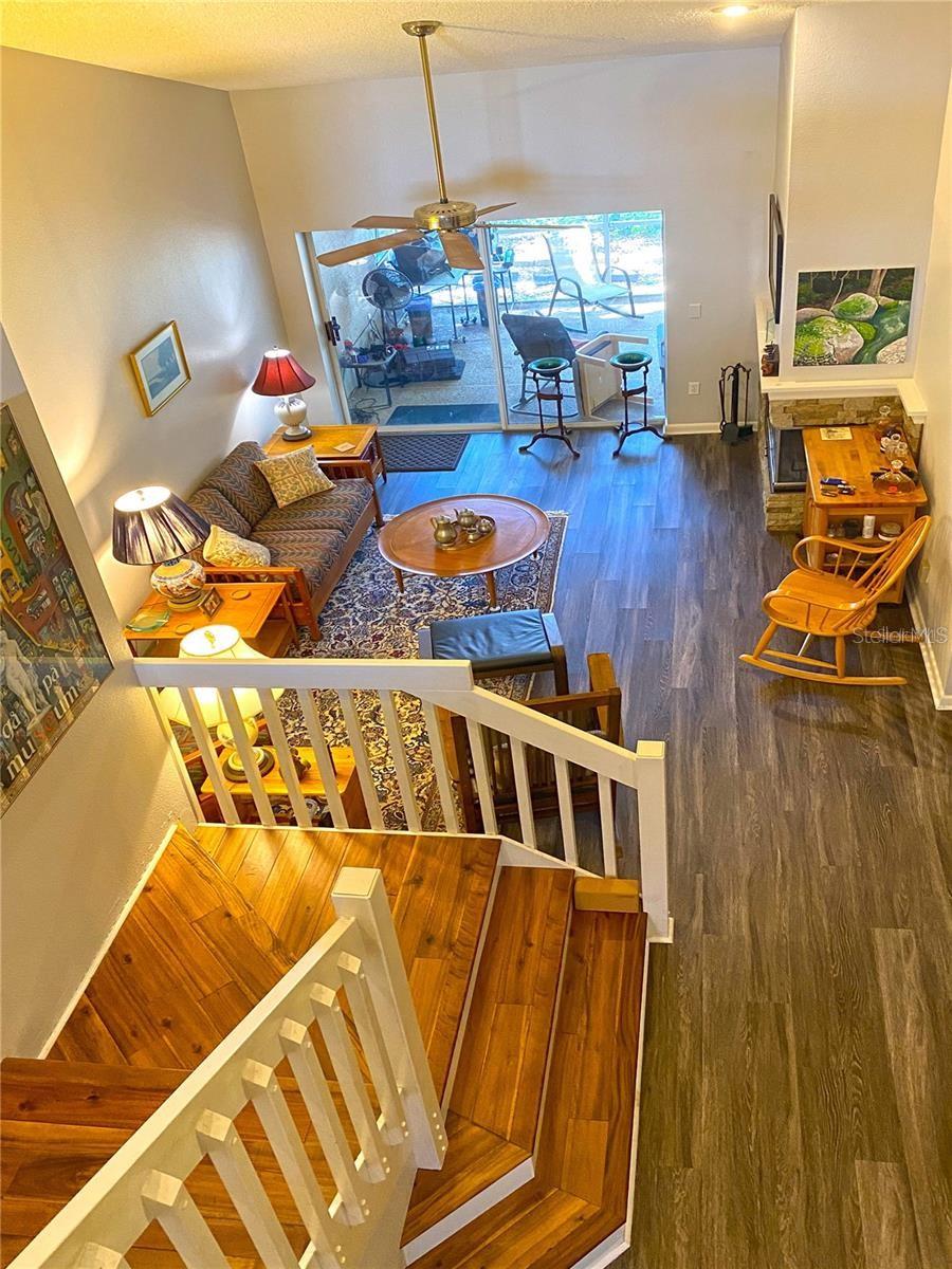 Step inside to discover vaulted ceilings and a spacious open-concept layout featuring a stone wood-burning fireplace and sliding glass doors leading to a screened-in porch – perfect for relaxing or entertaining.