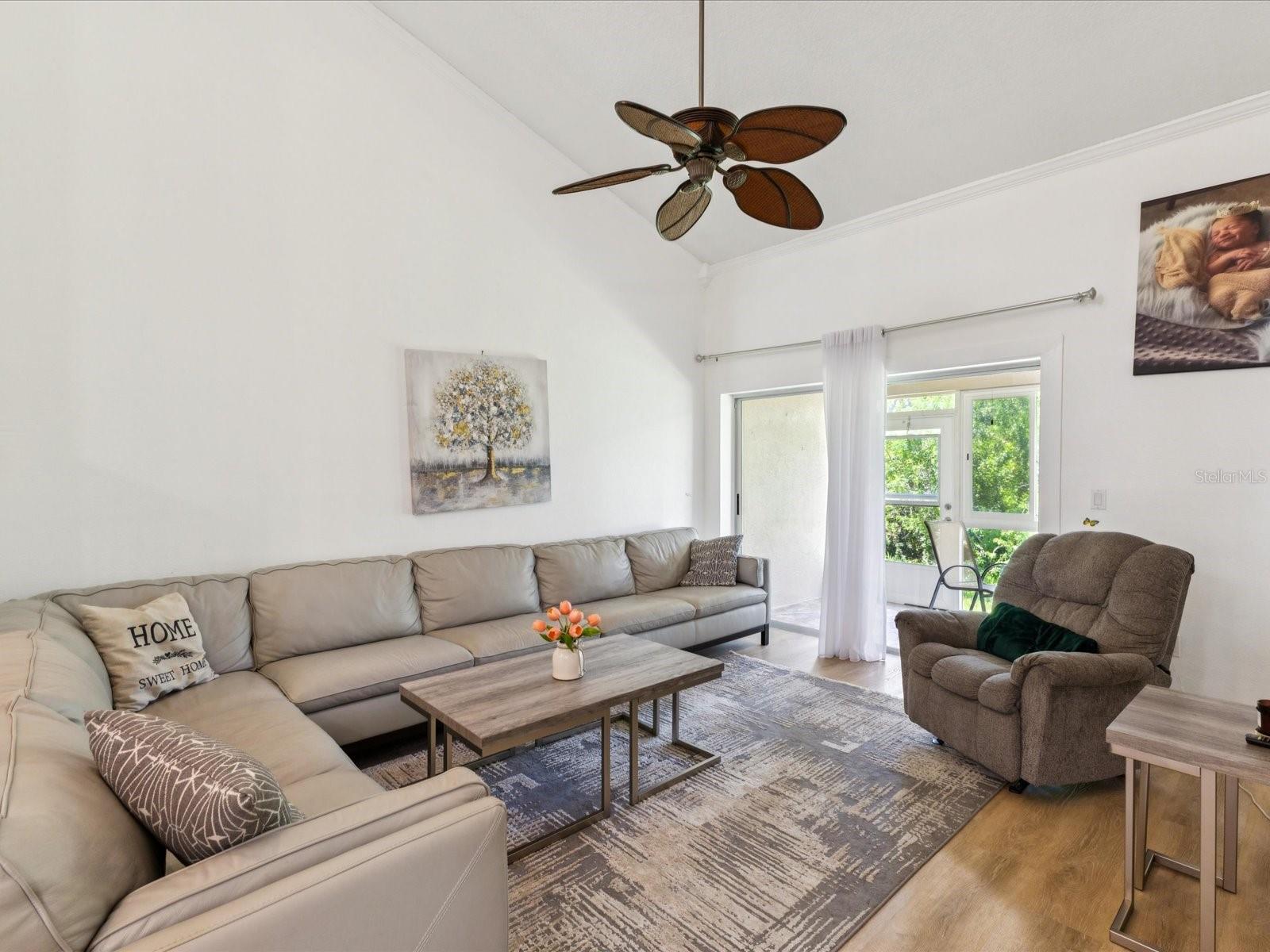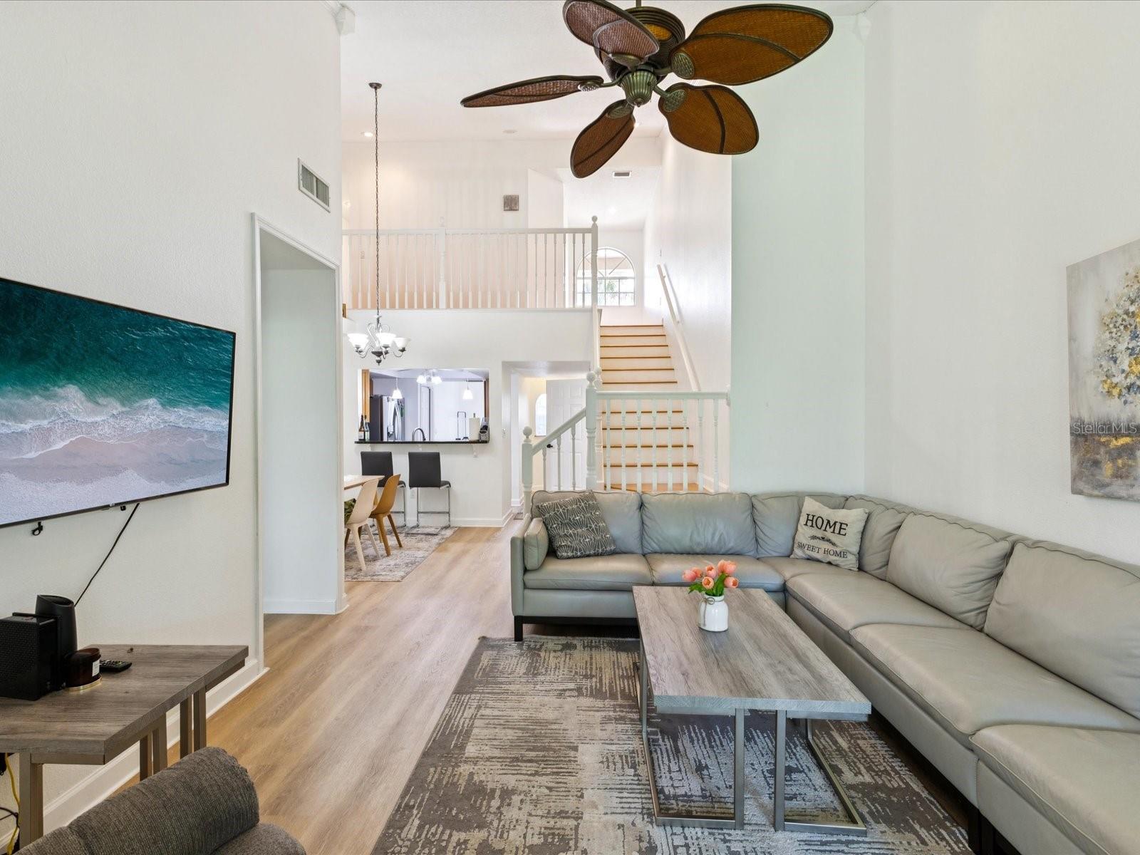 The first-floor primary suite is both spacious and private, offering high ceilings, access to the screened patio, and large windows that bring in natural light while offering views of peaceful, private greenery with no backyard neighbors. Upstairs, a versatile loft overlooks the main living area and provides the perfect setting for a home office, gym, or cozy lounge.