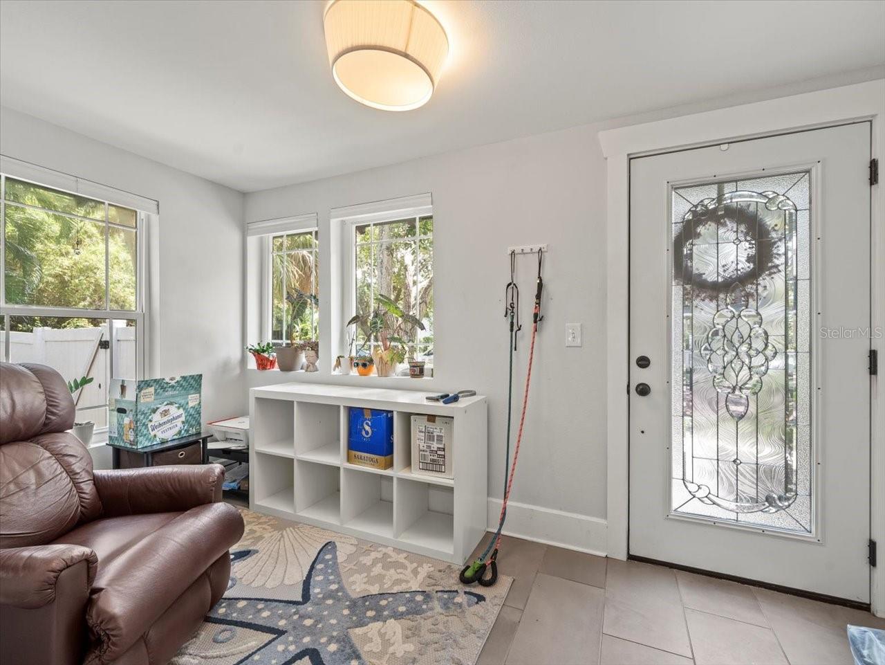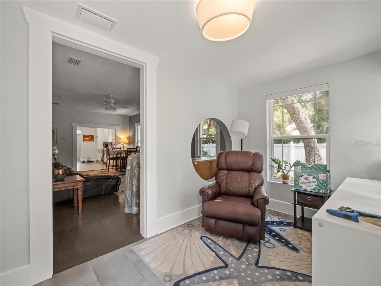 Step inside to a welcoming tiled foyer/flex room that's large enough for furniture, an office or perhaps a playroom? Make it your own! It also has a large "coat" closet and interesting circular cutout that is perfect for adding natural light to the spacious family room while maintaining some privacy. With original hardwood flooring, a timeless fireplace with mantle, and classic craftsman moldings throughout, you are instantly transported back to the elegance of the home’s 1938 origins. The updated kitchen features stone countertops, a farm sink with an old school window above, Thomasville soft-close cabinetry, and newer stainless steel GE appliances. This is all flowing seamlessly into the inside laundry/mudroom with backyard access. Once outdoors, enjoy a huge vinyl-fenced yard and an oversized side yard. There is a concrete patio for a grill or firepit, and a brand new deck for lounging and enjoying our Florida weather. Also, enjoy alley access and a large concrete parking pad for added convenience. Guest bedroom #1 is off the living area in the front of the home, and includes an additional "nook" ideal for a home office or nursery. The hall bathroom is shared with guest bedroom #2, has a bathtub and has been updated as well. The primary bedroom is roomy with a large closet and a lot of natural light. There is a beautifully appointed and updated ensuite bathroom with double sinks, a walk-in tiled shower, linen closet and direct outside access to the backyard and deck.