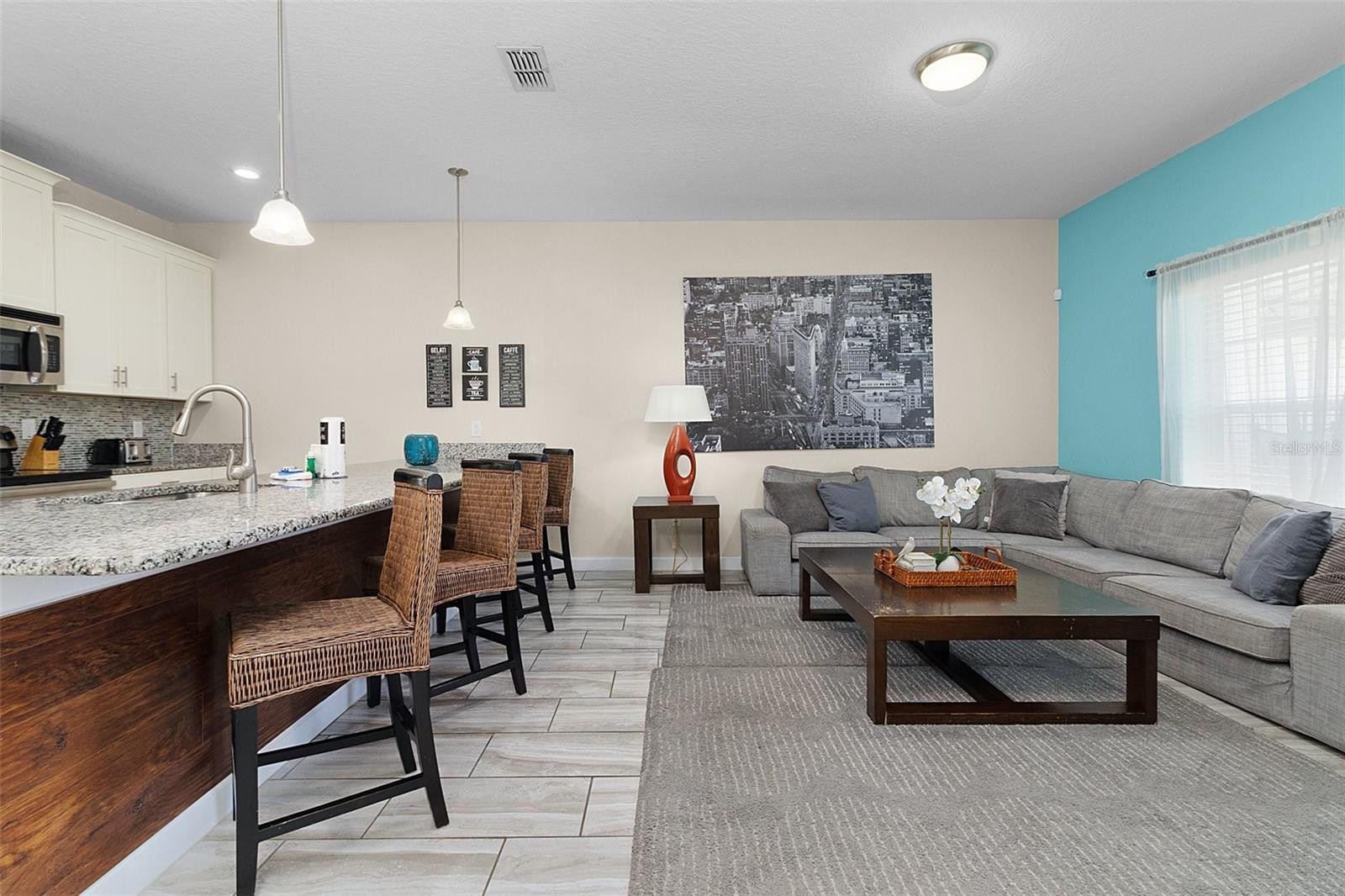 As you enter through the front door using your door code, be amazed by this READY TO MOVE IN home. The kitchen has robust WHITE 42"CABINETS, STAINLESS STEEL APPLIANCES such as built in microwave, dishwasher, range and side by side refrigerator. All granite countertops, granite ISLAND with double sink make this open kitchen/family room perfect for family gatherings and durable if you wish to rent it to SHORT TERM guests. The sliding doors in the main area lead to a covered patio area with a HEATED POOL with plenty of room to relax.