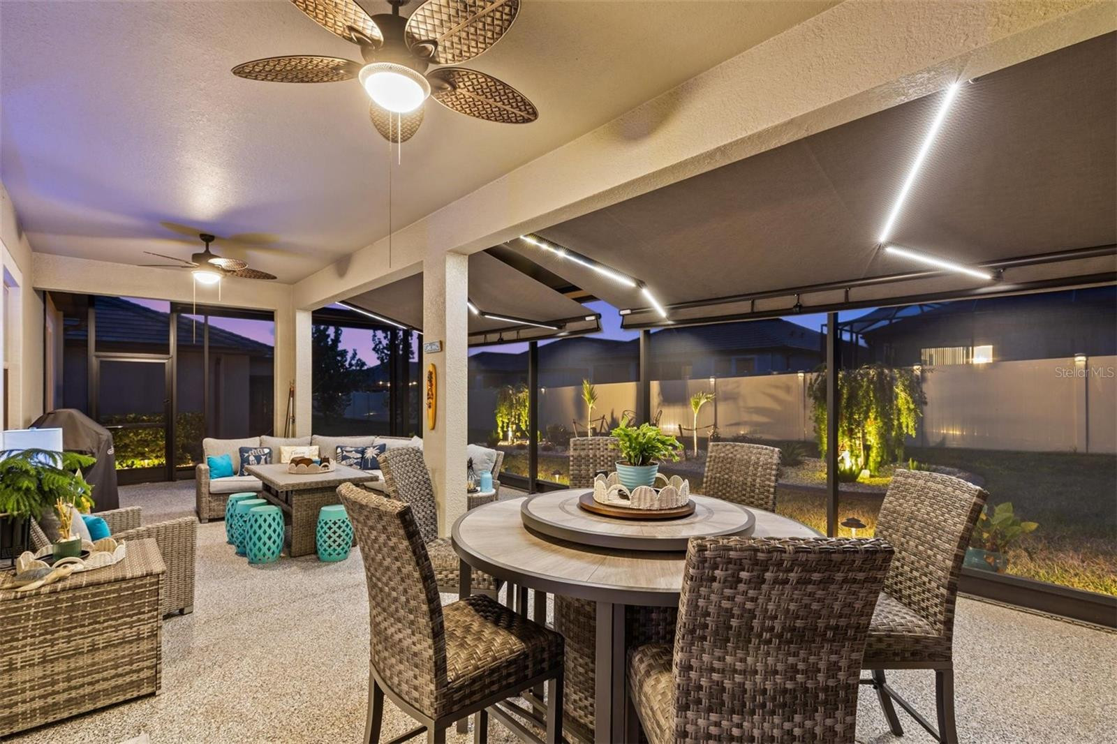Welcome to this extensively upgraded home in Medley at Mirada, a premier 55+ gated community offering the perfect blend of luxury, comfort, and an active lifestyle. Built in 2022, this 3-bedroom, 2.5-bath home with showcases over $100k in carefully selected enhancements that truly set it apart. From the moment you arrive, you’ll notice the upgraded front elevation with extended patio, premier driveway coating, and lush professional landscaping with brown border, exterior lighting, and a custom rear island. Inside, the open-concept layout is filled with natural light and anchored by upgraded ceramic tile flooring. The kitchen is both stylish and functional, featuring granite countertops, a spacious island with pendant lighting, a butler’s pantry, an oversized walk-in pantry, and a designer backsplash added in 2024. Adjacent living and dining areas flow into the home’s showstopping 600-square-foot screened lanai, expanded concrete slab under new flat roof and finished with epoxy flooring. This outdoor space is ideal for entertaining day & night and features a retractable motorized screen and two remote-controlled awnings with integrated lighting, all completed in 2023. The primary suite is a true retreat, complete with a walk-in shower, dual vanities, and a large walk-in closet fully customized by California Closet. A matching custom vanity with built-in drawers and ceramic tile flooring in the closet elevate the space. The guest bedroom includes its own en-suite bath, while the enclosed flex room with newly installed glass double doors in 2024 makes an ideal home office, 3rd bedroom, creative space, or additional guest area. The home includes a long list of smart and functional upgrades designed to enhance everyday living. A water softener with reverse osmosis was added in 2022, along with a whole-home Alexa system and remote-operated blinds by Tropical Elegance on the triple sliders. The garbage disposal was replaced in 2023, and all ceiling fans and the dining room chandelier were upgraded the same year. Sliding glass doors were replaced under warranty in 2024, with added double screens for improved airflow. Comfort continues with an Ecobee smart thermostat (2025), a whole-home surge protector, upgraded fridge and dishwasher, and a convection microwave oven. The flat roof was upgraded and extended with gutters in 2023 for durability and curb appeal.