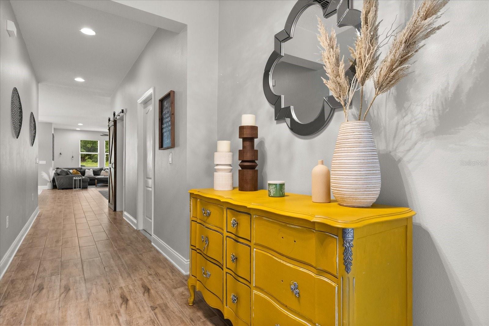Welcome to Serenity at RedTail. A beautiful, gated community nestled in the heart of Sorrento, Florida. This stunning 2,307-square-foot single-family home features 4 spacious bedrooms and 3 bathrooms. This residence combines comfort, modern style, and thoughtful design throughout. The kitchen shines with a NEW stone tile backsplash, updated appliances, and gold-finish touches on the faucet, soap dispenser, and cabinet hardware—adding a touch of luxury to everyday living. The laundry room has been transformed into a multi-functional space with a built-in desk, open wood shelving, custom storage, and a stylish sliding barn door. An added outlet provides flexibility to easily swap the dining and living areas to suit your lifestyle. Fresh interior paint throughout the home and a tasteful accent wall in the dining area create a warm, inviting atmosphere. NEW LED lighting has been installed throughout the home, including a state-of-the-art Wiz Smart Home Lighting System in the kitchen and living room, offering remote-controlled, color-changing lights to match any mood. Accent lighting in the main living areas and ceiling fans in every bedroom and the living room add both elegance and functionality.
