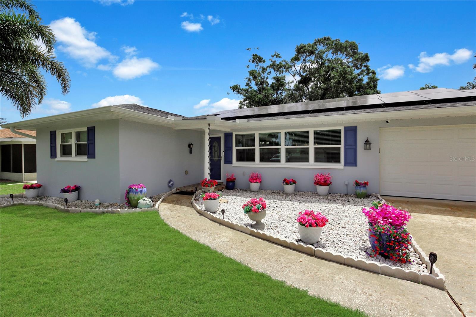 MOVE IN READY!! HANDICAPPED READY !! 2BEDROOMS, 2 BATHS HOME IN SUNSHINE ESTATES!! Fully Updated! Prime Palm Harbor location in the heart of it all! Own your piece of paradise now with this meticulously maintained one-story gem. The work has been done for you in this fantastic 2 BR + Florida Room / 2 BA, 2 Car Garage home with a salt pool AND POOL HEATER!! No HOA and owner does not pay for flood insurance currently! Approaching the property, you'll be impressed by its curb appeal, enhanced by recently installed exterior STORM WINDOWS AND NEW HURICANE WINDOWS IN THE FRONT AND NEW BLINDS IN THE FRONT!! window shutters and a newer ROOF (2018) WITH NEW GUTTERS !! Step into a welcoming open floor plan filled with abundant natural light! The UPDATED KITCHEN is a chef’s delight, featuring a spacious layout, breakfast bar, TALL CABINETS, stainless steel appliances, a tile backsplash, granite tops, AND NEW CERAMIC TILESS!! Perfect for entertaining, it opens to a family room with newer windows and recessed lighting. A cozy den leads to the Florida room through glass sliding doors, providing an indoor/outdoor feel. This room could easily be converted into another bedroom if desired! Both bedrooms boast large closets with built-in systems AND NEWER FLOORING!! Both bathrooms were UPDATED in the last few years with stylish tile, granite, and lighting THE HALL BATH HAS A NEWER INSTALLED walk-in BATHTUB!! Step outside to your oasis! The salt pool, surrounded by a pool cage and beautiful pavers, awaits your enjoyment. A newer PVC fence adds to your privacy. Additional features include newer paint (inside/out), AC (2016), a Meyer lemon tree, added gravel in the front and back, backyard sod, a concrete walk path on the side of the house, a well for the lawn irrigation system, and included washer and dryer. THE SOLAR SYSTEM IS LEASED AND THE OWNER ONLY PAYS $155.00 a MONTH. Help with the electric bill, also the owner purchased a TESLA POWER WALL 3 battery backup!!
