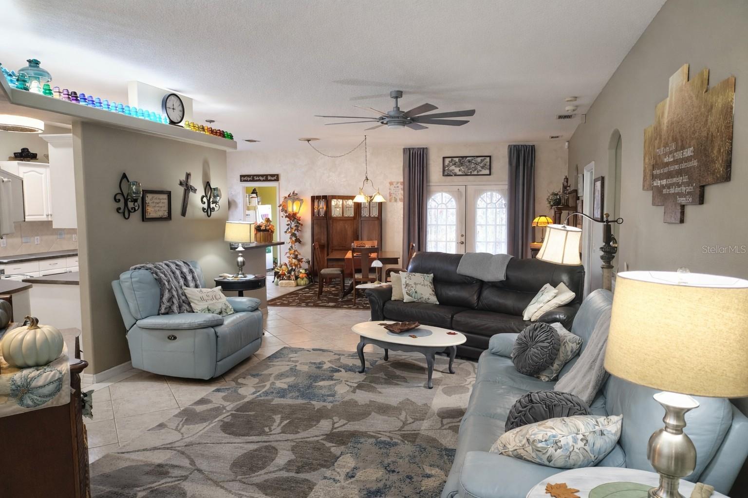French doors lead from the living area to the screened-in lanai — the perfect setting for morning coffee, evening relaxation, or weekend gatherings. Open the doors during cooler months to enjoy fresh breezes and seamless indoor-outdoor living.