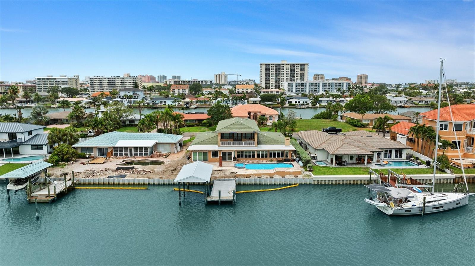 One or more photo(s) has been virtually staged. Create your waterfront dream home on Island Estates! This rare open water property offers breathtaking open Intracoastal views, over 80 feet of prime water frontage—ideal for boating, panoramic views, and maximizing your waterfront lifestyle, a brand-new seawall (2025), and deep-water canal access—bring your boat and enjoy quick Gulf access. The existing 3-bedroom, 3.5-bathroom home with an dem/office and 2-car garage features a private upstairs primary suite with en suite bath and its own balcony overlooking the water. The home was professionally remediated after flooding—dry, structurally sound, and ready to be beautifully renovated or reimagined to suit your style. Enjoy a pool and jacuzzi (virtually staged) overlooking the water. A large covered dock makes for the perfect waterfront setup. Major updates include a new AC (2024), roof (2019), and most windows and doors updated in 2020. Located in a golf cart-friendly island community, just minutes from Clearwater Beach, dining, shopping, and the Clearwater Marine Aquarium. Sold AS-IS—bring your vision to life! Some pictures have been virtually staged.