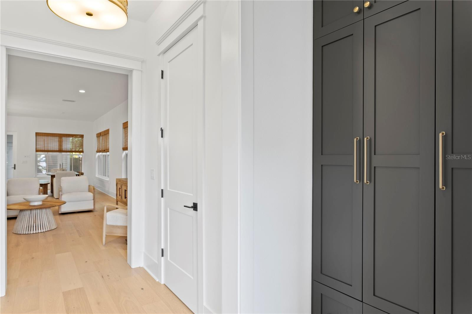 Inside, the first floor welcomes you with an expansive open-concept layout that effortlessly connects the living, dining, kitchen, and office/den spaces. Ten-foot ceilings and wide-plank engineered white oak flooring create a sense of volume and warmth, while 8-inch baseboards and exquisite millwork reflect the home's attention to detail. The gourmet kitchen serves as the heart of the home, featuring custom cabinetry, a marble-topped island, brass hardware, and a GE Monogram appliance package—including a 36-inch chef-inspired gas range. It’s both a showpiece and a functional culinary space.