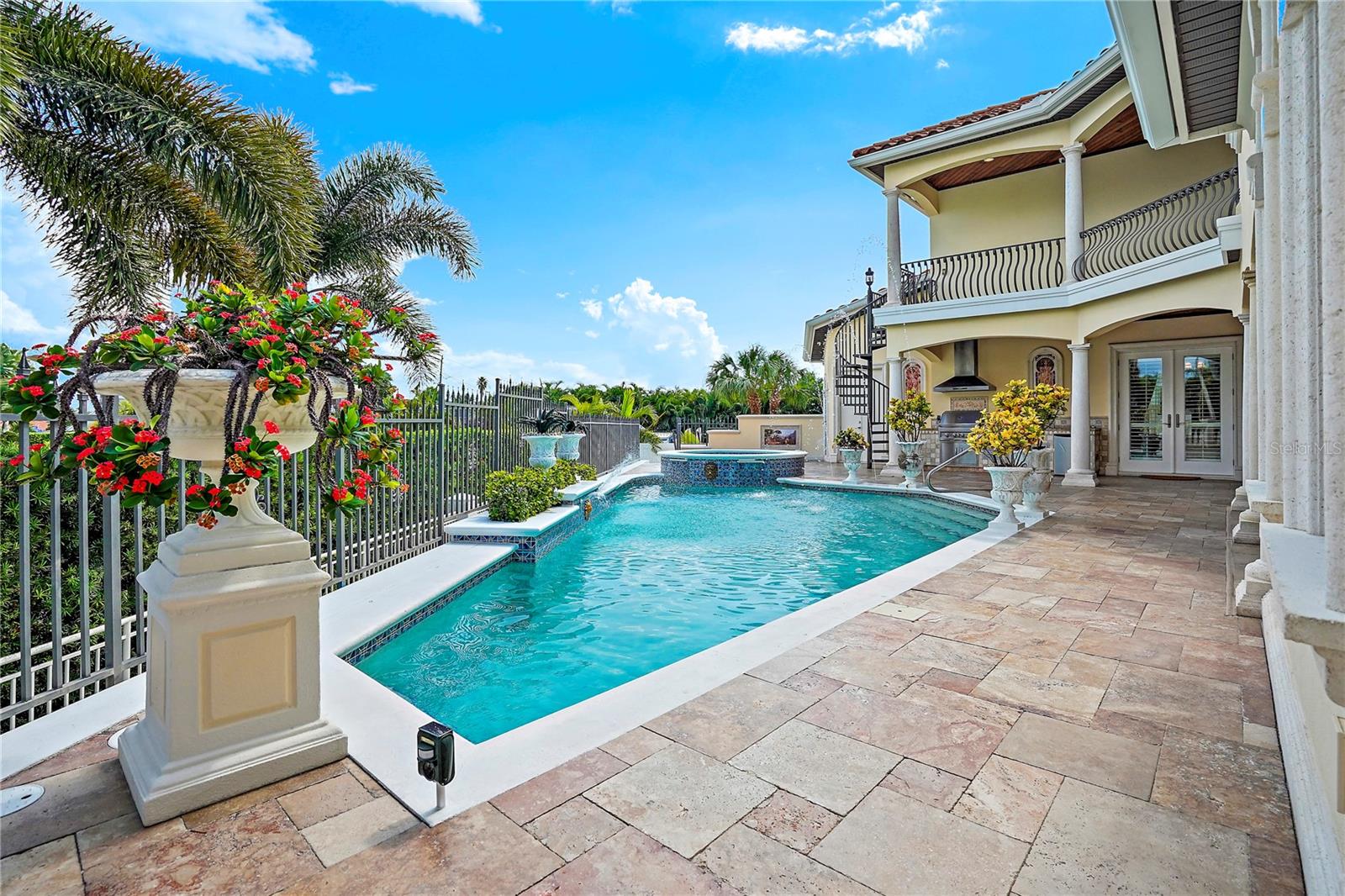 Outside, your private resort awaits. The saltwater pool and spa shimmer beneath the Florida sun, framed by natural stone pavers, lush lounging spaces, an outdoor kitchen with an infrared grill, and a custom-tiled outdoor shower worthy of a boutique hotel. From intricate wrought-iron staircases to custom steel detailing, the craftsmanship here is unforgettable.