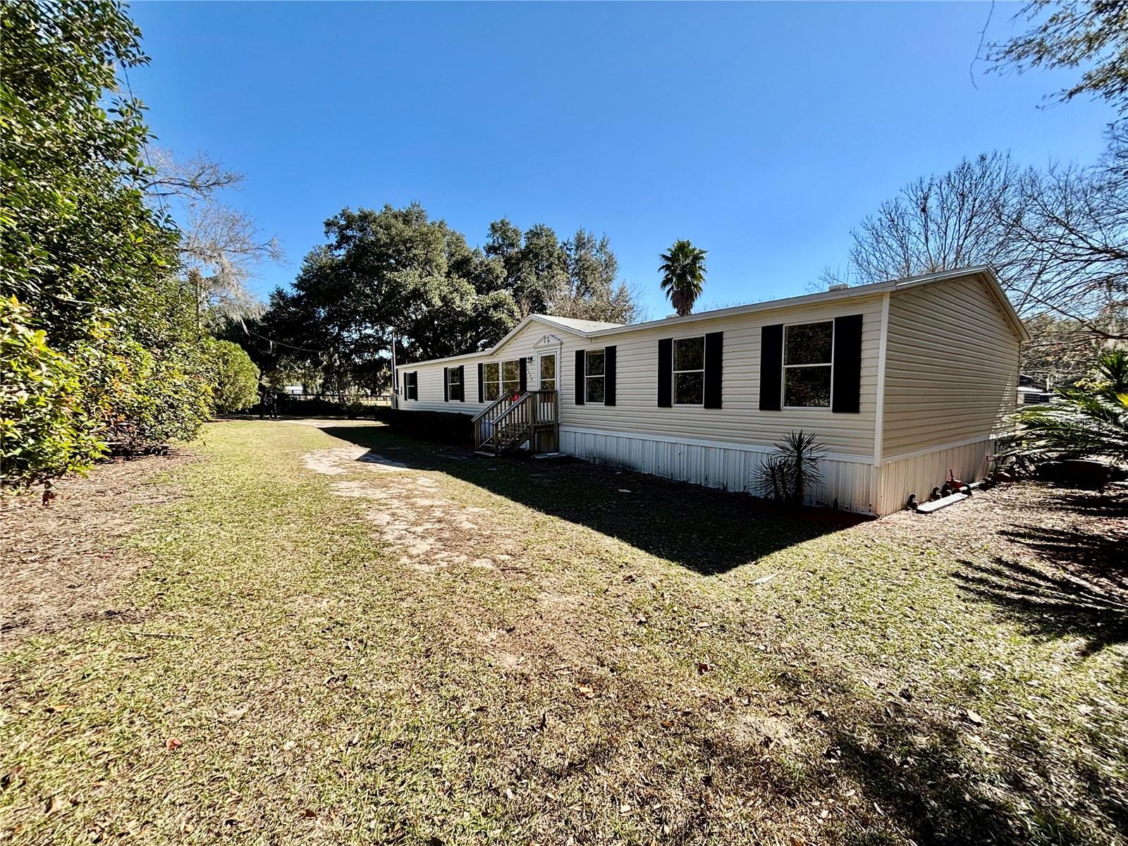 One or more photo(s) has been virtually staged. This beautifully renovated 4-bedroom, 2-bathroom mobile home, boasting over 2,100 sq. ft. of living space, is nestled on a private 1-acre lot, offering modern comfort and ample room to spread out. Inside, the home features two main living areas and a split floor plan, making it perfect for families or those seeking versatility. The primary suite includes a private office or bonus area, a large tub, and a separate shower, while all four bedrooms boast walk-in closets for plenty of storage. Recent renovations include luxury vinyl flooring throughout, fresh floor-to-ceiling paint, a fully updated kitchen with new cabinets, counters, and butcher block accents, as well as updated bathrooms with stylish new vanities. Outside, the property is a true retreat with orange, banana, and grapefruit trees, a screened gazebo for relaxing or entertaining, and a handicap-accessible ramp on the back porch. The home also comes equipped with a full home generator, a recently replaced roof (2020), and a septic system pumped in 2023, ensuring peace of mind for years to come. Tucked away off the main road, this property offers privacy, functionality, and charm. Schedule your showing today to explore everything this incredible home provides!