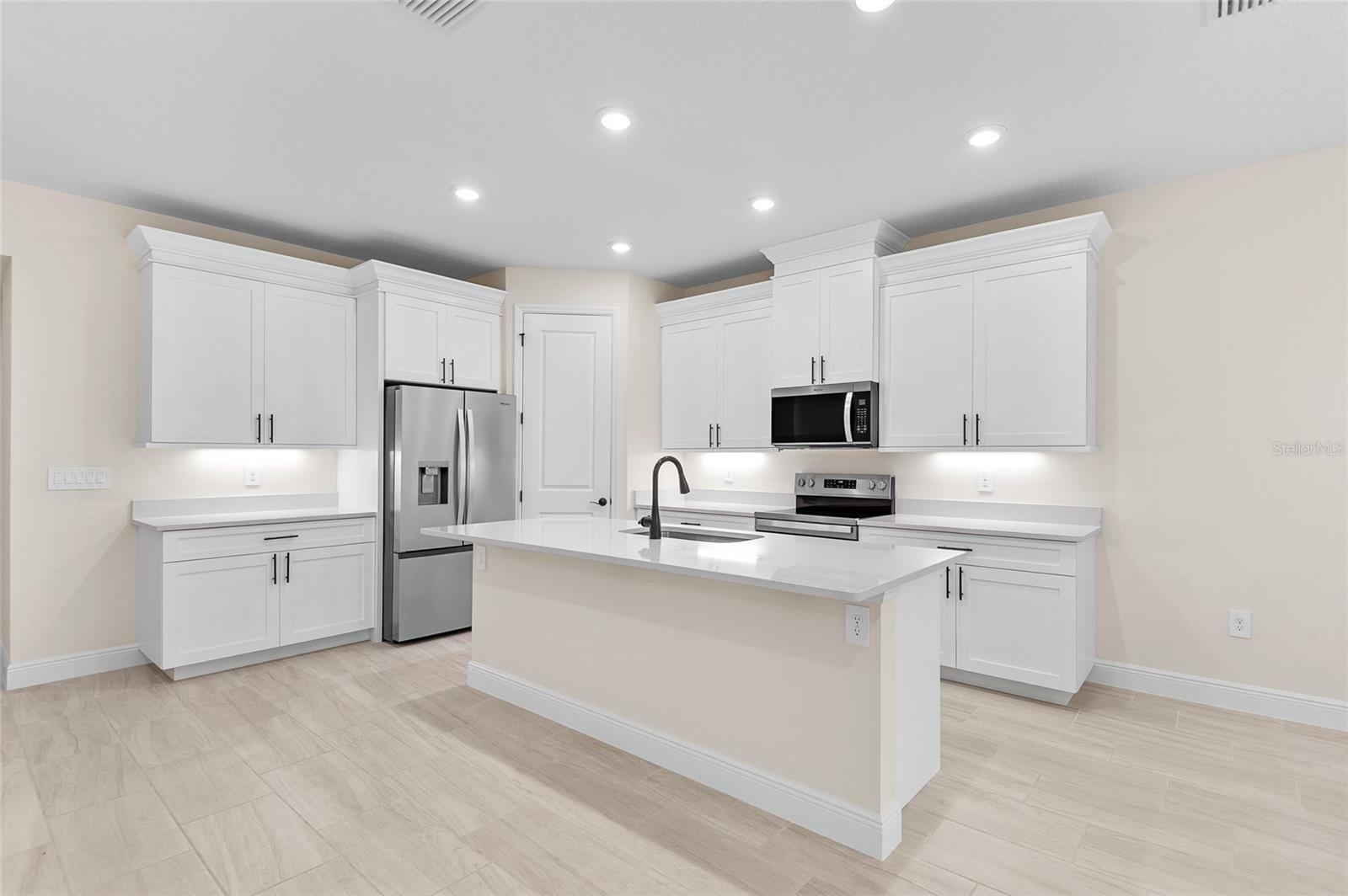 At the center of the home, the chef’s kitchen features a large quartz island, 42-inch upper cabinets, a sizable pantry, and stainless steel appliances, making meal prep and hosting a breeze.