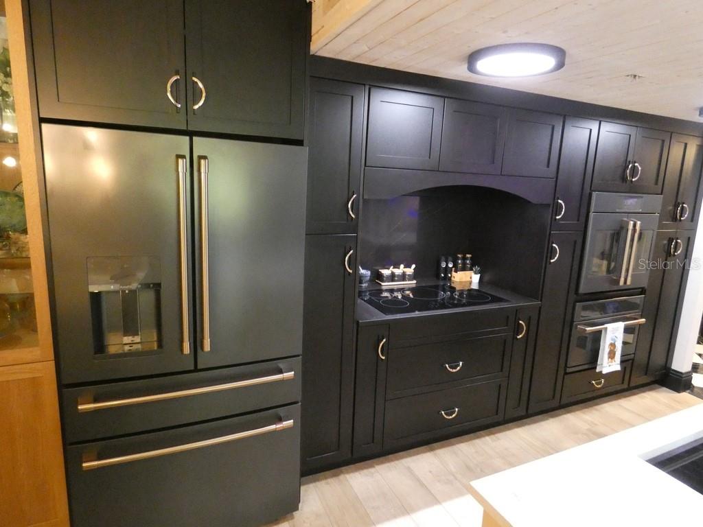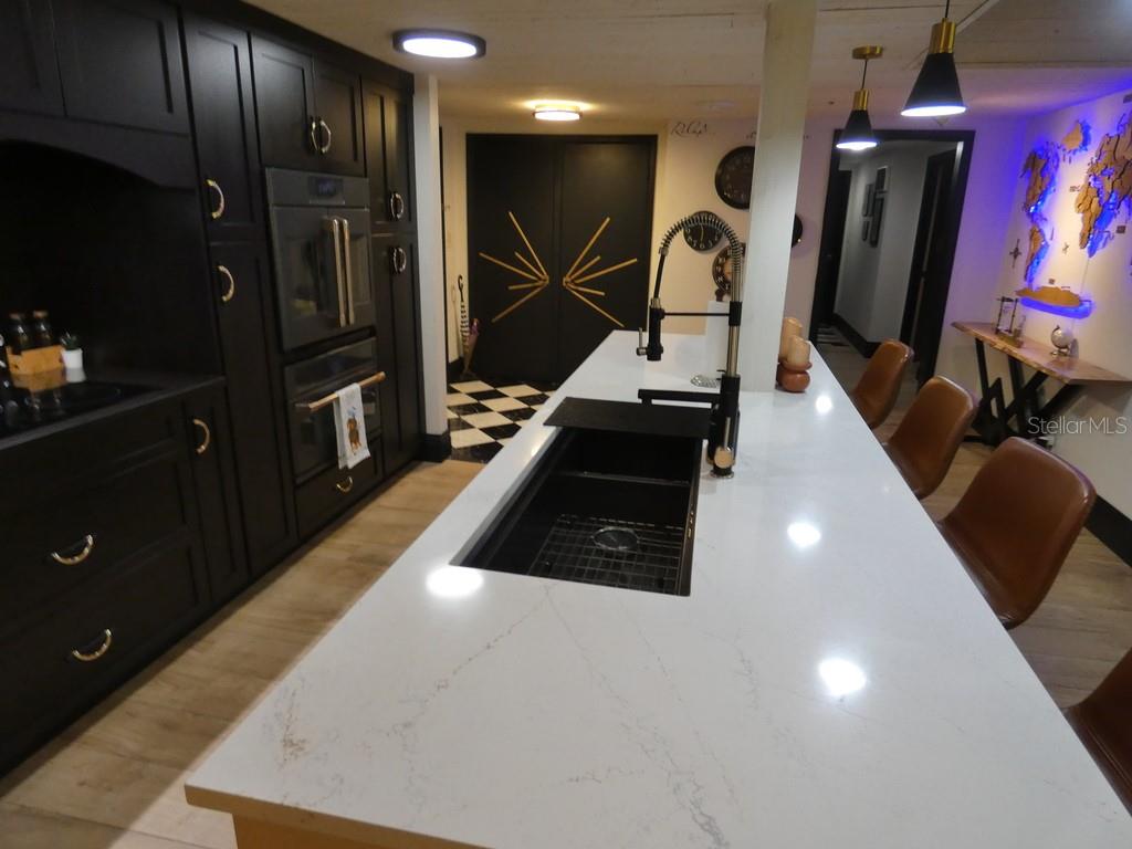 Nestled into the surrounding mature trees in The Innisbrook Golf and Tennis Resort you will enter this modern, moody loft condo that exudes all the urban charm with a dark, earthy edge. You will instantly view a spanning open-concept layout with all-encompassing natural light from floor to ceiling sliding doors. The matte black finishes against the warm tone flooring create an intimate, luxurious ambiance that will seat you directly on the comfortable, low- profile modern furnishings. A custom, modern dry bar set-up will seamlessly connect all your guests from kitchen to living areas and entertainment den. At the center of this loft condo is a custom gourmet kitchen designed for both form and function. The stained black cabinetry with two sprawling quartz islands and premium fixtures elevates the space for hosting intimate dinners of hand-crafted culinary delights to the most passionate of Foodies. It is a treasured haven for any aspiring French Baker as it is outfitted with GE Cafe Smart, Wi-Fi baking appliances. It becomes clear that storage is abundant throughout the kitchen spaces including a custom built floating buffet to house all the serving necessities.