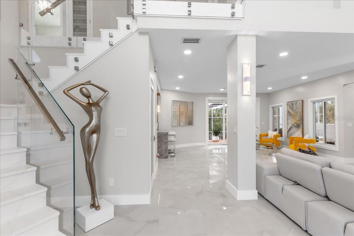 COMPLETE LUXURY MAKEOVER! (Back on market after buyer couldn't get financing) Welcome to your modern dream home! Not a single detail was untouched in this carefully thought out full 2024 remodel. From the baseboards to the designer air vents every detail is impeccably done. The kitchen remodel was a labor of love. Full cabinet replacement with lighted drawers, NEW appliances, High-end Essenza Quartzite waterfall countertops found only in luxury homes is extremely difficult to install and it's flawless done in this gourmet kitchen including full encapsulation of the island. High end tile backsplash, Polished Porcelain 32x32 Onyx tile throughout 2nd & 3rd floors, Heimey designer chrome door knobs, Single panel glass interior doors, Every outlet & light switch is NEW, Jaw dropping modern glass light fixtures and chandeliers all brand NEW. All bathroom cabinets were replaced with modern floating vanities and vessel sinks. SMART toilets, LED mirrors, NEW faucets & drains in ALL bathrooms. Master has triple sided gas fireplace leading to the ensuite featuring a concrete vanity designed by a local artist opposite a free-standing soaker tub & walk-in shower. Staircase is CALCUTTA Sunset Quartz (nicer than most countertops) with floating Frameless glass railings & chrome accents inside and outside on all balconies. The centerpiece of the living area is a one-of-a-kind 20ft tall LED lit accent wall. Modern luxury in the heart of Oldsmar sitting on an ACRE of land. NO HOA. Flood insurance is approximately $800./yr and transferable. Ground floor gameroom/ gym/ flex space out to 1400 sq ft of pavered pool deck & 2 story screen enclosure. Saltwater pool with spillover Spa, OUTDOOR kitchen. A/C (2023), ROOF (2022), ELECTRIC PANEL (2023), HURRICANE RATED WINDOWS & SLIDERS (2017), POOL PUMP (2024), TANKLESS WATER HEATER (2018). Store your boat and RV on your 1 ACRE fully fenced & gated private lot. Close proximity to 3 waterfront parks, PICKLEBALL, boat & kayak launch, fishing pier, restaurants, Tampa International Airport and the most beautiful beaches in the world. Schedule your showing today. This home was meticulously designed and must be seen to be appreciated.
