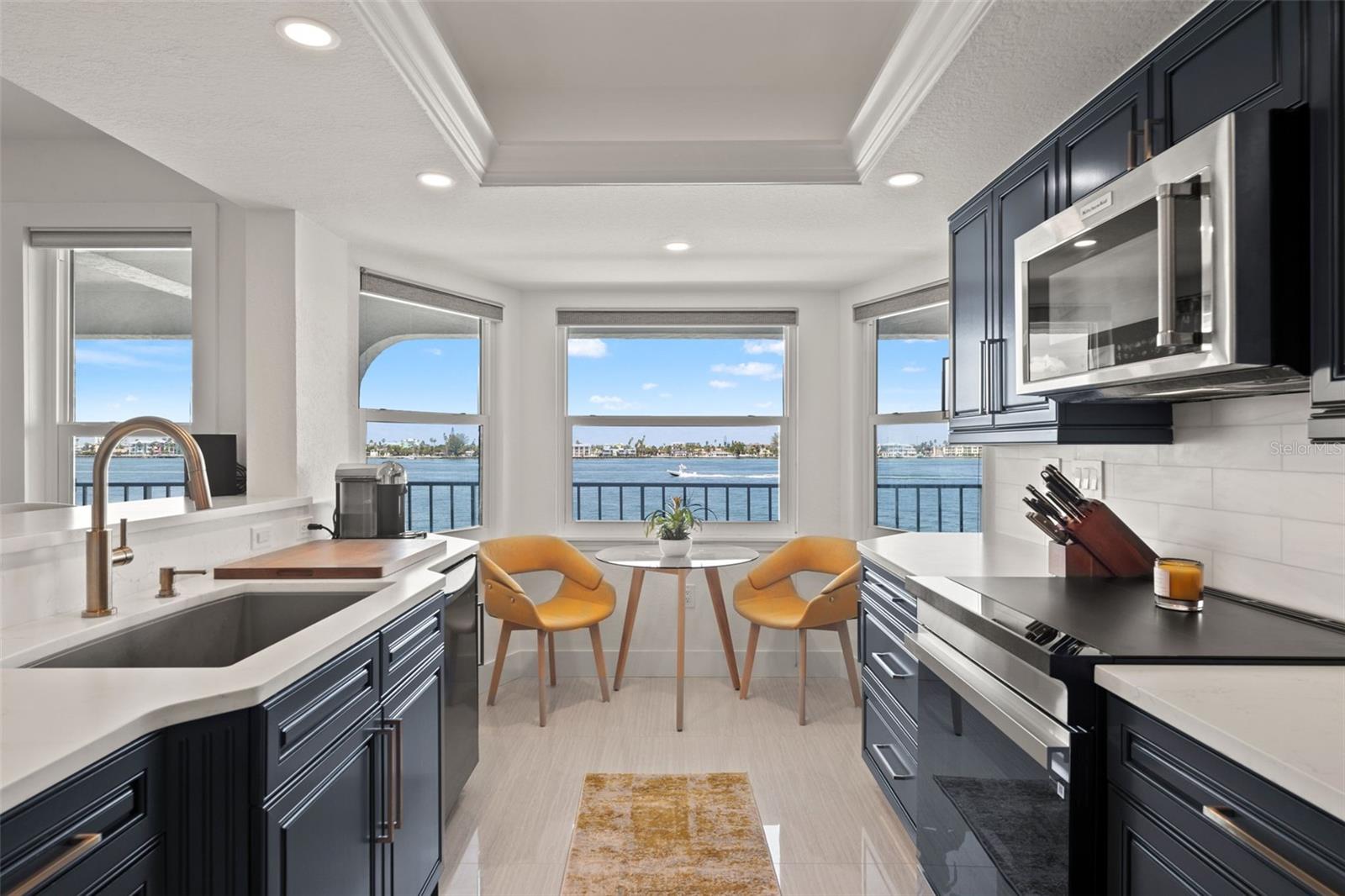 This exceptional condo has been completely renovated with impeccable attention to detail. The 2-bedroom, 2-bath residence features 180-degree water views, HURRICANE IMPACT WINDOWS, and elegant Spanish porcelain tile throughout. The open floor plan includes a spacious living room with a wood-burning fireplace, chef’s kitchen with quartz countertops, custom wood cabinetry, stainless steel appliances, an induction cooktop, and custom LED lighting.