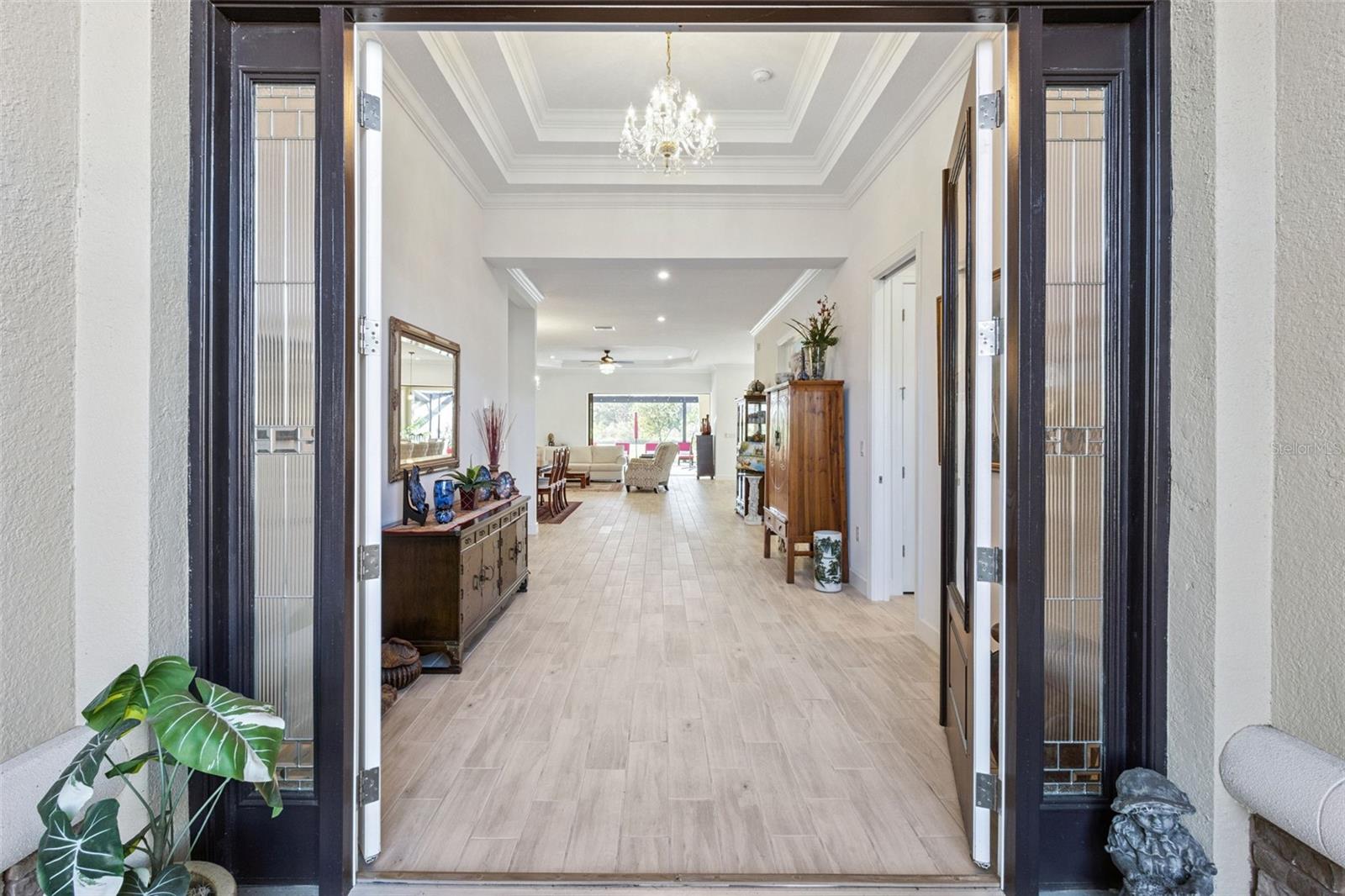 DOUBLE POCKET GLASS SLIDING DOORS open seamlessly to the OVER EXTENDED and ENCLOSED LANAI creating a true indoor-outdoor living experience with tranquil CONSERVATION VIEWS and SPECTACULAR SUNSETS. The Lanai is already Plumbed for an OUTDOOR KITCHEN and includes exterior lighting along with a relaxing HOT TUB featuring dedicated electric and a built in ASTROTURF AREA ideal for furry friends or to use as a practice Putting Green, ideal for the avid Golfer! Interior highlights continue with a SPACIOUS PRIMARY SUITE offering a large Walk-in closet and Walk-in SHOWER with built-in benches, UPGRADED BATHS and LAUNDRY ROOM with CUSTOM TILE FLOORING and extra cabinets for storage, custom built-ins, ceiling fans, window treatments, FRENCH DOORS added to the Office/Flex room (the only home of this model with this feature), an OVERSIZED GARAGE with EPOXY-FINISHED Floors.