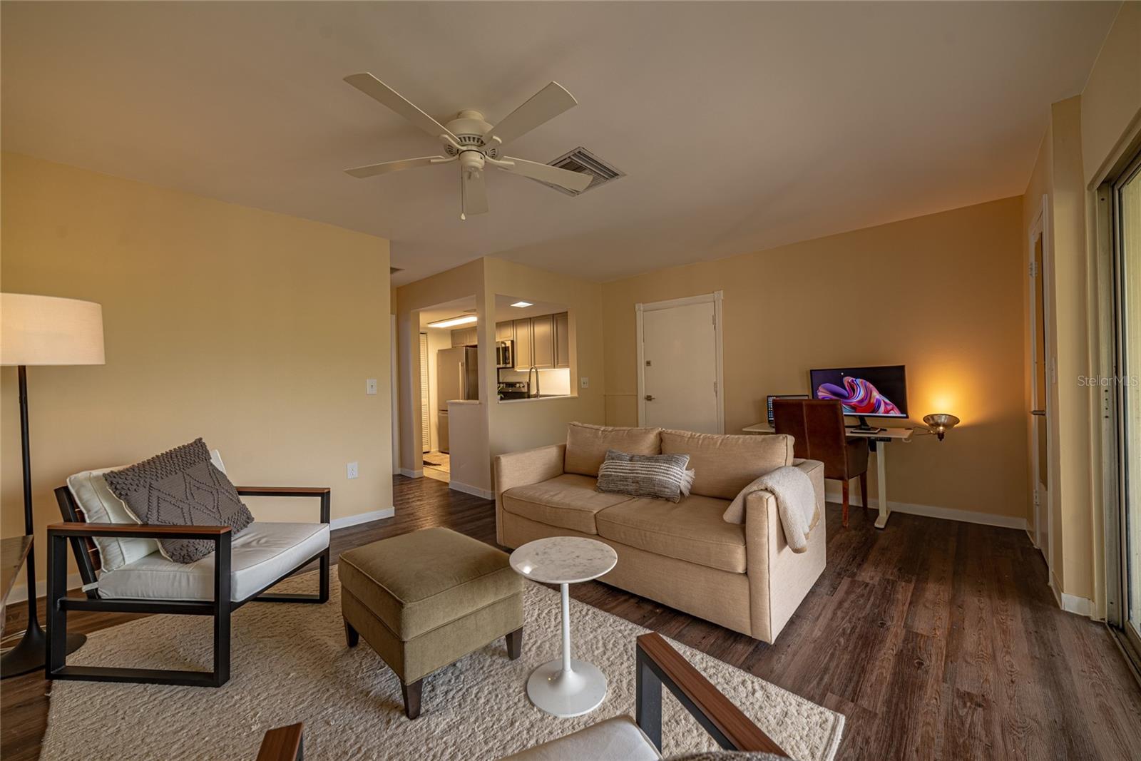 Come and discover one of the most desirable units in the gated community of Whisper Lake! This beautifully updated 1-bedroom, 1-bathroom condo is move-in ready and ideal as a first home or an excellent rental investment! Step inside to an open-concept living and dining area that flows seamlessly to a private screened patio—your perfect spot to unwind while enjoying views of the sparkling pool and lush mature trees. The kitchen shines with refreshed cabinetry, a deep sink, and sleek stainless steel appliances, while natural light floods the space through large sliding doors, creating a warm and inviting atmosphere throughout. The spacious bedroom offers a walk-in closet, plush new carpet, and plenty of comfort. The bathroom has been tastefully remodeled with a modern vanity, new bathtub, and stylish contemporary finishes. Additional upgrades include a brand-new electrical panel with surge protection, updated flooring, fresh interior paint, upgraded door hardware, and professionally installed insulation above the living room for improved energy efficiency. For added convenience, the great room offers a second walk-in closet that can easily double as a home office.