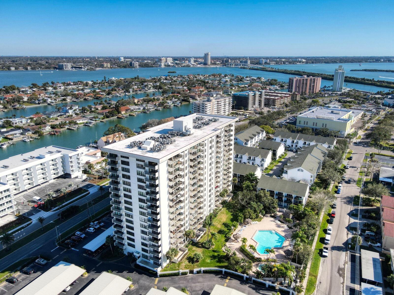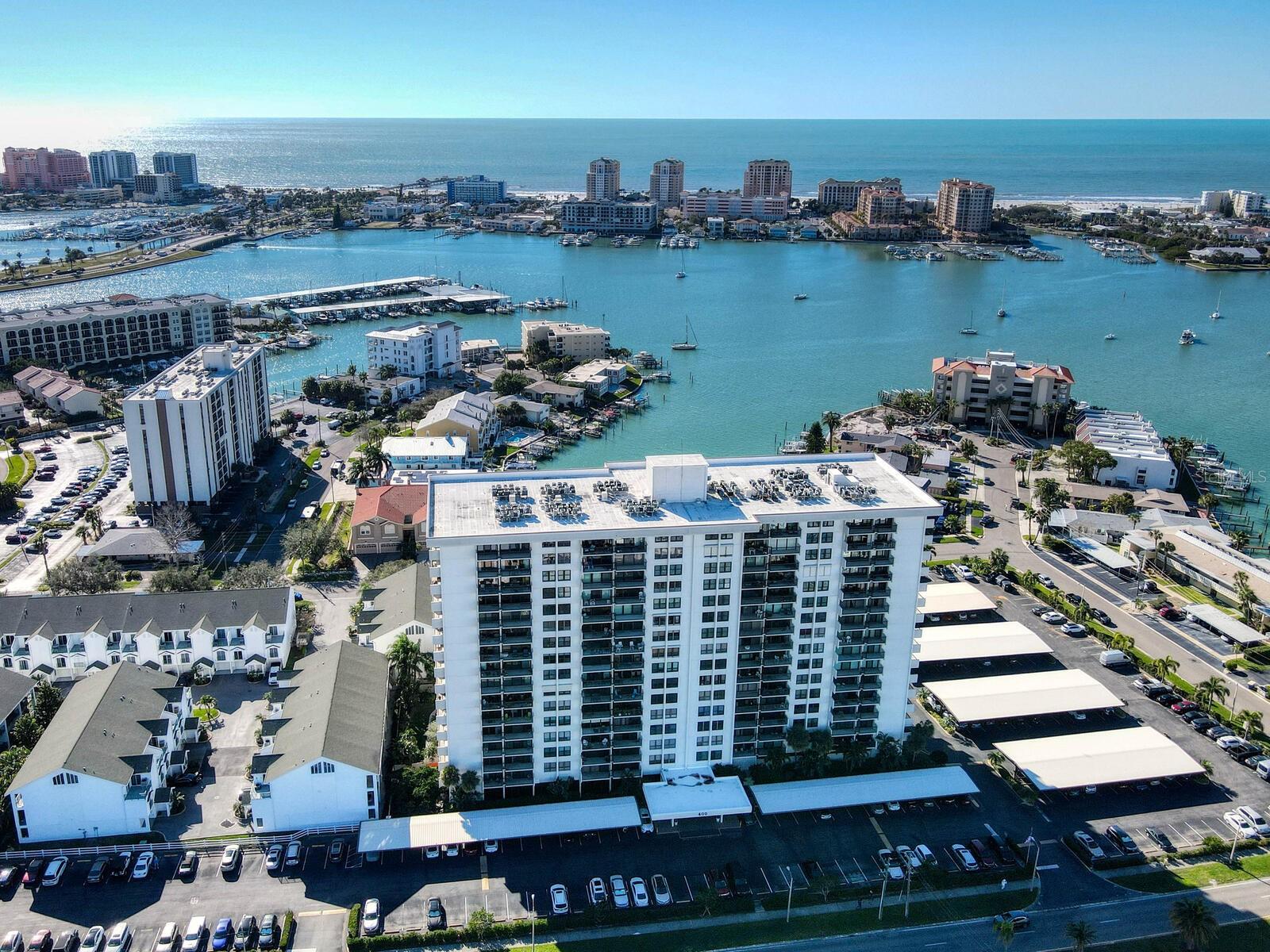 HUGE price improvement! Wonderful opportunity to own this 2 bedroom 2 bath condo in Starboard Tower Clipper Cove Condo on popular Island Estates! With restriction on ownership before leasing and a 3 month minimum rental period, this could be a fantastic opportunity to live in it part time and rent out the rest of the year or...just a rental. A jolly trolley ride away from Clearwater Beach or stay on longer all the way down to St Pete Beach! The secure building with fob access welcomes you with porte-cochere and an elegant lobby. Unit 308 has a beautifully updated kitchen with new cabinetry, quartz counter tops and new laminate flooring. Secondary bathroom completely renovated with gorgeous travertine tile. Linen closet plumbed for stackable washer/dryer. Living/dining room have brand new luxury vinyl floors and is open to a balcony so you can enjoy the seaside breezes. Bedrooms have new carpet and windows hurricane impact windows. Interior freshly painted! Amenities include an enormous community pool and hot tub, grilling area and picnic tables, exercise room, the Captain's Cabin with kitchen, pool table and sitting area, storage units and laundry. There is also the building's Yacht Club across the way should you want to host private events overlooking the intracoastal or just go fishing! Island Estates is home to the Clearwater Aquarium, popular Island Way Grill and you have a Publix grocery store right at your fingertips! Come enjoy the Island lifestyle!