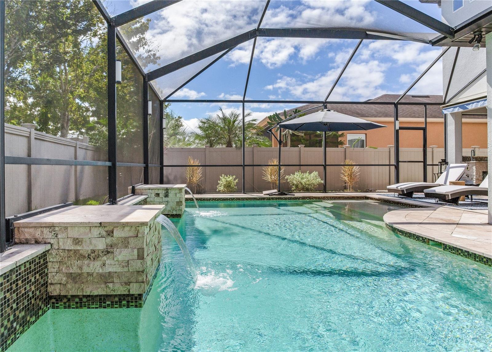 Immaculate Pool Home with Designer Upgrades and Timeless Finishes! Welcome to this beautifully maintained and upgraded residence nestled in the highly desirable Estancia community. This stunning two-story home offers an inviting open-concept layout designed for modern living and effortless entertaining. The updated kitchen is the heart of the home—featuring a custom extended island with new quartz countertops, a designer tile backsplash, stainless steel appliances, double ovens, and abundant cabinetry for storage. The kitchen flows seamlessly into the spacious living and dining areas, filled with natural light and elegant details such as crown moulding throughout, neutral tile flooring, and designer lighting. Upstairs, you’ll find generously sized bedrooms including a luxurious primary suite with a large sitting area, tray ceiling, and a spa-inspired bath with dual vanities and a walk-in shower. Step outside to your private Florida oasis! Enjoy a screened-in pool with stacked-stone water features, a sun shelf, and a new SunSetter powered awning (2025) for added shade and comfort. Relax in the above-ground spa under a covered pergola or entertain guests in the outdoor kitchen area. The yard is partially fenced (two of three sides) for privacy while maintaining an open, airy feel. Additional highlights include a three-car garage, freshly repainted exterior (April 2025), upgraded fixtures throughout, and energy-efficient features. Located near top-rated schools, shopping, dining, and major highways—this home blends style, comfort, and convenience in one perfect package