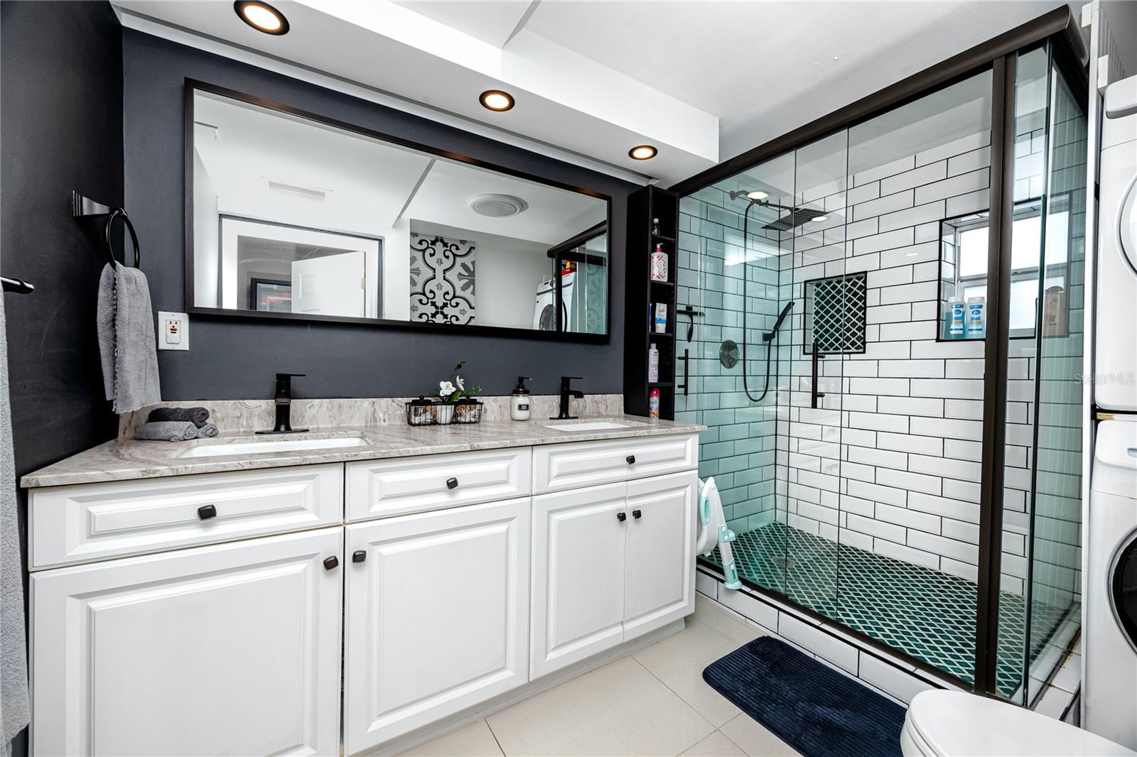 A smart split-bedroom layout provides privacy and versatility. The expansive primary suite, tucked behind classic French doors, features vaulted ceilings with a natural wood beam, multiple closets, built-in shelving, sliding glass access to the backyard, and an ensuite bath designed for relaxation. The bath includes a soaking tub, dual-sink vanity, LED-lit anti-fog smart mirror, and modern fixtures—all just steps from a private door leading to the outdoor retreat. Two additional bedrooms share a beautifully updated bath with a tiled walk-in shower, rain showerhead, quartz-topped vanity with generous storage, and a full-size stacked washer and dryer.