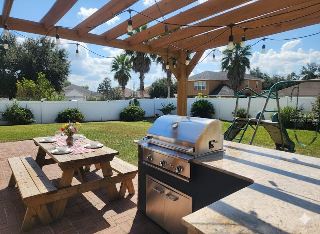 One or more photo(s) has been virtually staged. Short Sale. This home has room for everyone. Almost 1900 square feet of living space and designed for indoor and outdoor living. Oversized cascading sliding doors lead to a large screened patio, a pergola with an outdoor kitchen and a fenced back yard. New roof in 2024, solid surface countertops, and beautiful modern appliances. A portion of the 2 car garage has been renovated into a living space, yet a sperate space remains for all your garage storage needs. Low HOA still offers plenty of amenities, and the centralized location makes for easy access to the Highway 200 corridor and I-75.