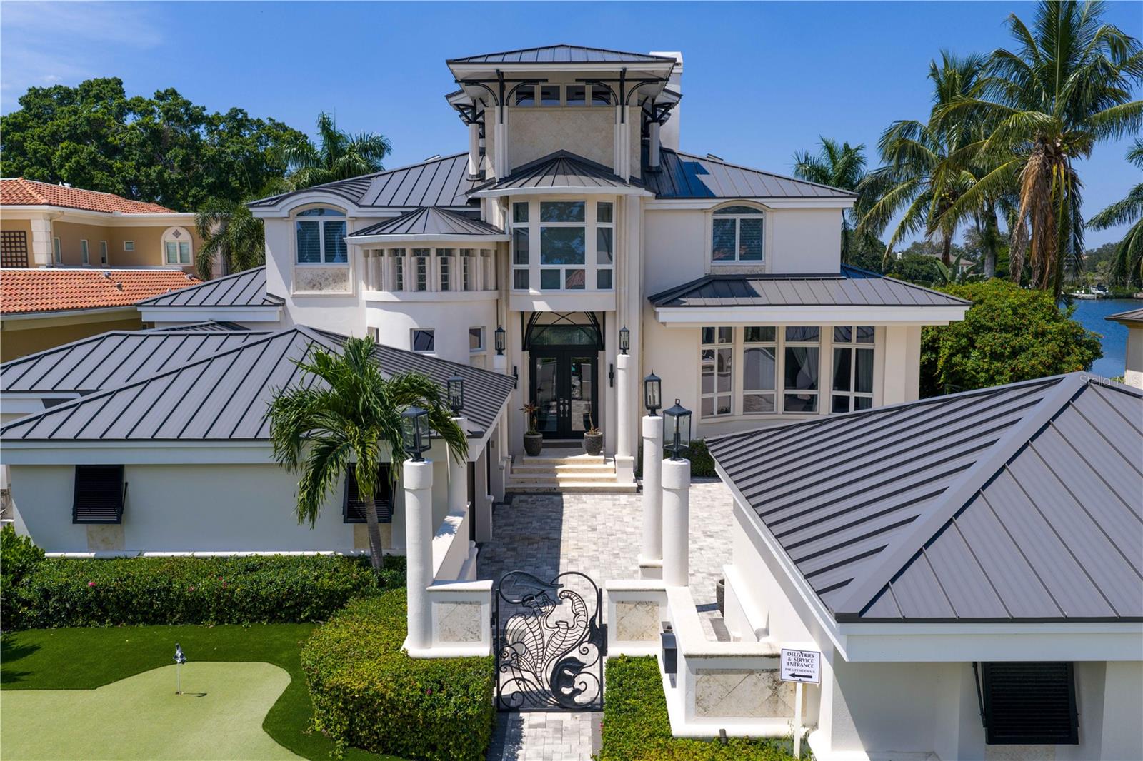 Welcome to this exquisite estate on Coffee Pot Riviera, a half-acre lot on a protected inlet of Tampa Bay. Right away you are drawn to the vine-inspired wrought iron gates making a striking first impression to the property's entrance. The overall style of the home pulls together unique architecture elements of organic, nature-inspired design. A jaw dropping grand entrance blends a functional structure requirement with a creative artistic design of columns that resemble the natural form and texture of trees allowing this three-story open living space to seamlessly integrate with the waterfront landscape. The tongue-and-groove ceiling of this space is reminiscent of a boat's hull, which enhances the spacious, open airy feel of the home, like the feeling of being on a luxury yacht. Bringing this all together, creates a magnificent three-story wall of windows flooding the house with natural light, offering views of the water and creating a seamless connection between the indoor and outdoor spaces. It’s simply stunning! Next you are drawn to the expansive outdoor area which was carefully designed to provide much-needed shade and comfortable, covered living space that connects beautifully to the extra large backyard, large infinity pool and waterfront. A grandfathered boat house offers a rare and valuable feature to protect your watercraft. Everything has been updated and enhanced by the current owners with the addition of new flooring throughout, updated bathrooms and kitchen, brand new metal roof and ALL (three) new AC units. An added bonus is the primary bedroom being on the first floor as well as another bonus room that could be used as a bedroom with a full bath, media room or office. The other guest bedrooms are all on the second floor. A four car garage (two have been converted to a gym) gives you the flexibility for extra cars or a workout space. This sophisticated design combined with Florida's tropical landscape will give you a luxurious yet comfortable living experience in the heart of fabulous St Pete! No flooding. Ready for immediate occupancy. Can be sold furnished. All furnishings new from Restoration Hardware, Arhaus, and Timothy Oulton.