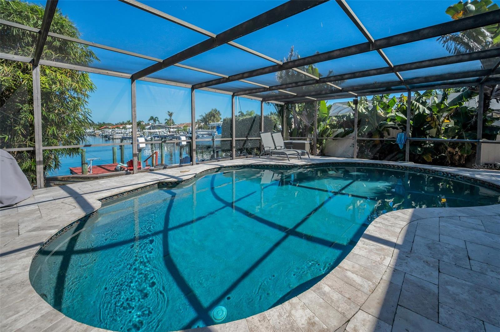 Broadwater. Extremely well maintained waterfront pool home. The base area is over 9ft above sea level protecting it from any flooding. No damage from either storm. Three bedrooms, two baths, 2,262sq.ft. of living area, and a two car garage. Open floor plan with living/dining area, family room, and a large Florida room overlooking the newly renovated pool and water. Newly installed hurricane impact sliders all the way across the back facing the water. Other features: Large private maintenance free Xeriscaped property with beautiful brick pavers in front, side, and backyard areas. Pool completely refurbished in 2020 with Travertine decking and new pebble sheen finish, new primary bedroom vanity, new A/C in 2017, new hot water heater in 2017, new electrical service panel in 2017, large inside laundry area, natural gas, reclaimed water, lush landscaping, rear fire pit patio overlooking the water and more. New owner to reap the benefits of Solar panels that were installed in 2019 slashing power bills! Excellent overall location with easy access to shopping, dining, I-275, Tampa, and Sarasota. Wonderful well kept waterfront community. Be sure to view the beautiful virtual tour.