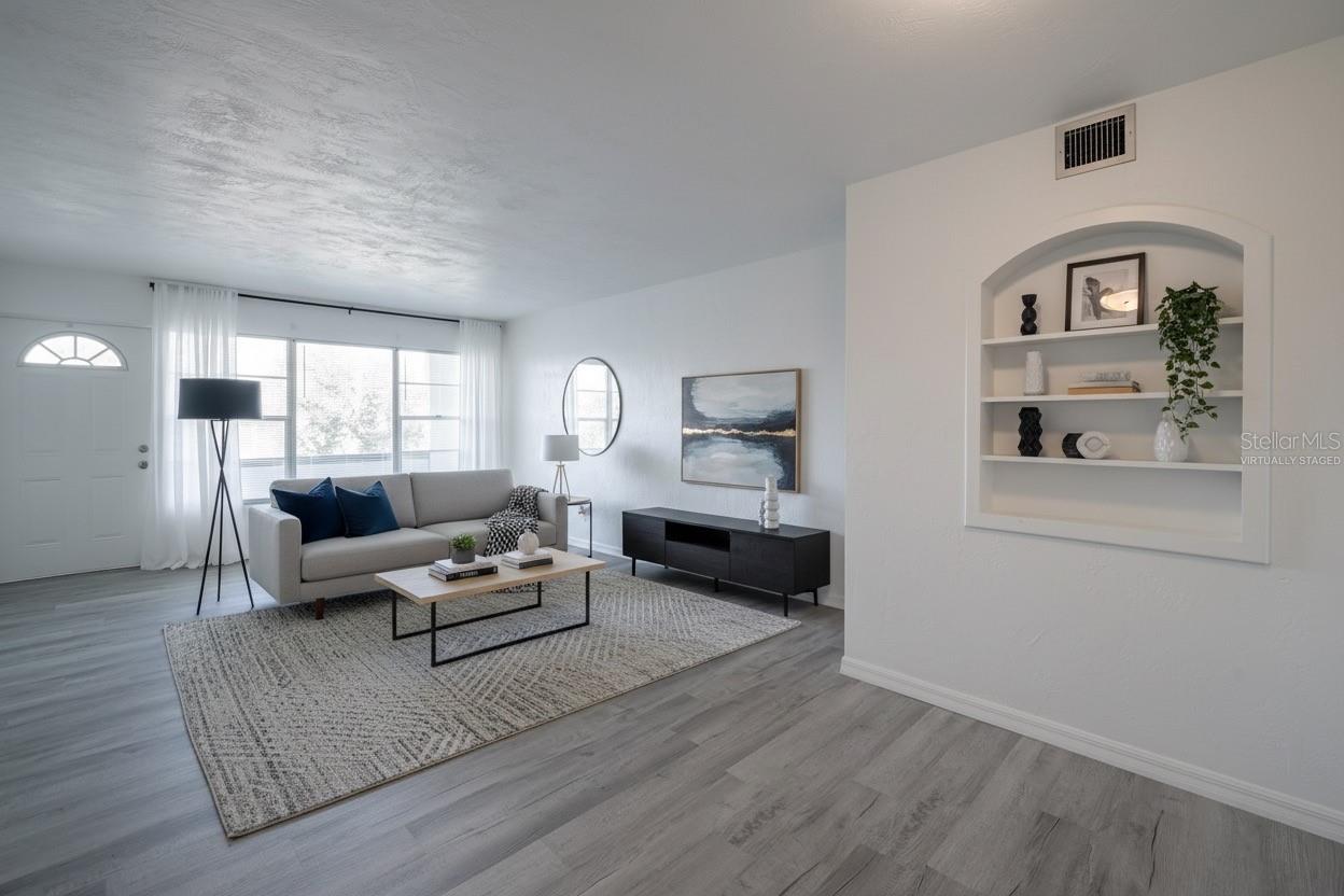 Excellent value! Property updated in August/September 2025 as follows: new paint throughout; new baseboards installed; new luxury vinyl plank flooring throughout; new bathroom vanity, fixtures, mirror, sink/shower accessories, and toilet; new kitchen stove and sink/faucet; new electrical switches and plates. New HVAC June 2024. Seller will contribute to buyer closing costs with acceptable contract. Oversized living room with dining area, two bedrooms with adjoining bath and a kitchen with room for an eat-in area. This home also features a large Florida room overlooking a peaceful green space. Large common area laundry room and elevator are conveniently located on the same floor around the corner from the condominium. Excellent opportunity to make this second-floor home your own and live in a lovely well-maintained 55-plus community with reasonable HOA fees. The HOA fee includes cable TV, internet, maintenance exterior, maintenance grounds, escrow reserves fund, insurance, sewer, trash and water. Each home has an assigned parking space. Milestone and Structural Integrity Reserve Studies are complete and immediately available. Centrally located, this area is close to everything you could need, grocery stores, shopping, restaurants, parks and stunning beaches!