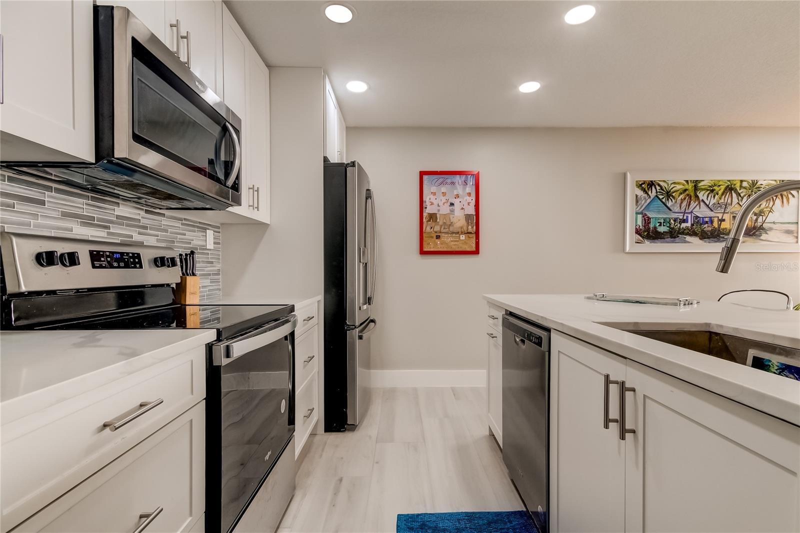 shaker Kitchen cabinets, quartz countertops, and a stainless steel sink, Stainless steel appliances, New doors and fresh paint throughout the unit. A highlight of the community is the spacious plaza deck, which offers breathtaking views of the Gulf of Mexico—an inviting spot for residents to relax and connect with neighbors. Here is the Resort-style amenities include: 24-hour gated security, Covered private garage parking, guest parking, Gulf-front heated pool and sun deck, Grill area, Shuffleboard and bike storage, Well-equipped fitness center with sauna, Clubhouse and community room