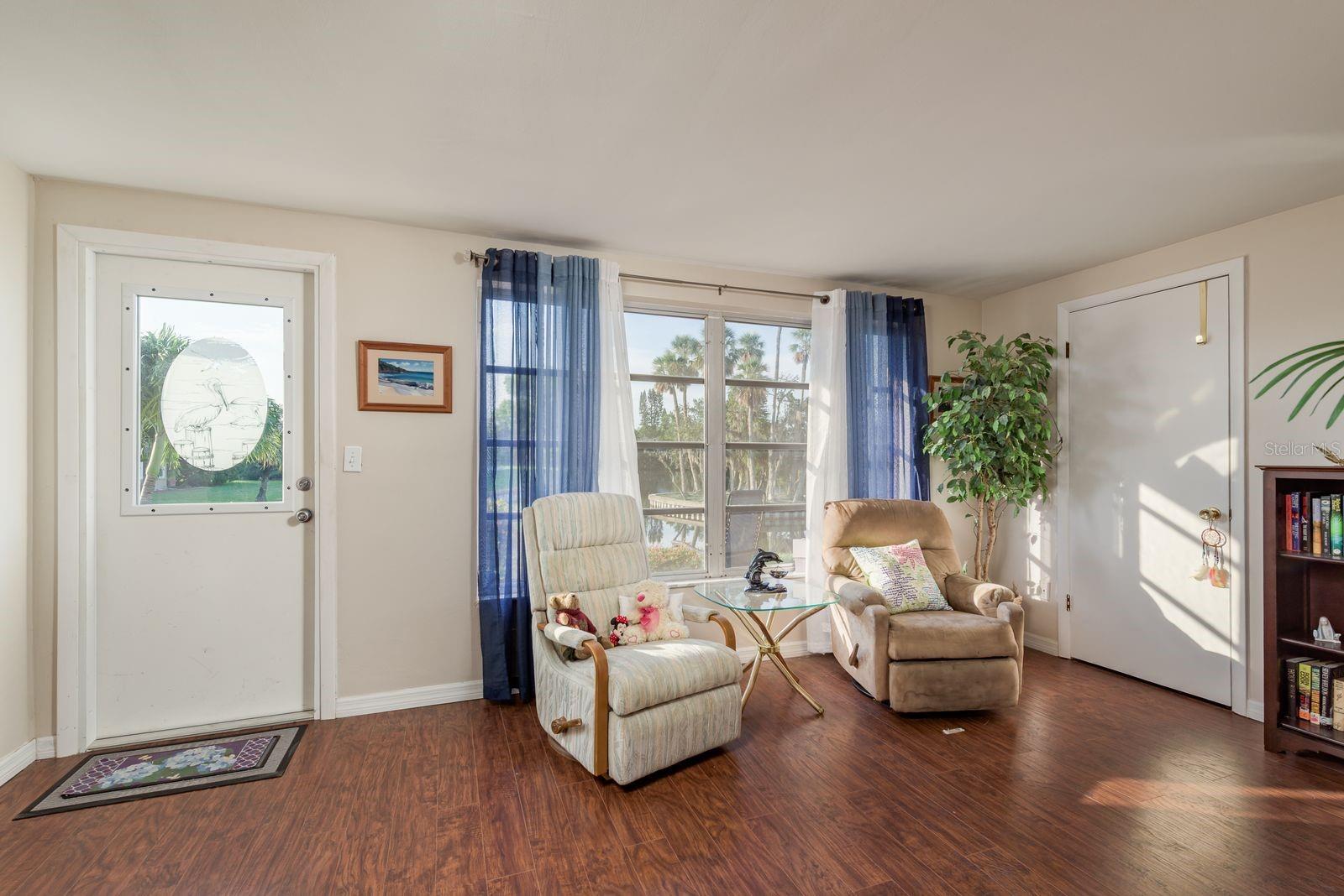 NO WATER DAMAGE OR FLOODING FROM HURRICANES HELENE OR MILTON. Welcome to effortless Florida living in this beautifully maintained 2-bedroom, 1-bath lakefront villa located in the highly desirable 55+ gated community of Gardens of Beacon Square. From the moment you step inside, you’ll appreciate the bright, open, and airy feel of this 1,011 square foot home. Engineered hardwood flooring enhances the main living areas, while the refreshed kitchen offers granite countertops, shaker-style cabinetry, ample counter space, and a stainless steel sink, perfect for everyday living and easy entertaining. The spacious primary bedroom provides comfort and privacy, and the updated bathroom features a walk-in shower, modern vanity, and marble tile flooring. One of the standout features is the Florida room overlooking the tranquil lake. Start your mornings with coffee and water views, or unwind in the evenings enjoying the peaceful setting. This versatile space is ideal as a reading nook, hobby area, or home office. Step outside and enjoy the quiet surroundings that make this community so special. Additional highlights include private in-unit laundry with a Whirlpool stackable washer and dryer, assigned covered parking just steps from the door, and the option to purchase furnished, making this truly a lock-and-leave opportunity. The Gardens of Beacon Square offers outstanding amenities including a heated pool, clubhouse, library, billiards, shuffleboard courts, fishing areas, and social activities. The HOA covers cable, internet, water, sewer, trash, exterior maintenance, insurance (including flood insurance), pest control, landscaping, and gated security providing a worry-free, maintenance-free lifestyle. Conveniently located near Gulf Coast beaches, shopping, dining, medical facilities, Tarpon Springs, and downtown New Port Richey, this home offers both comfort and convenience at an attractive price point. Whether you’re looking for a full-time residence or seasonal retreat, this lakefront gem delivers easy Florida living in a community where every day feels like a vacation. Schedule your private showing today and see why so many love calling Gardens of Beacon Square home.