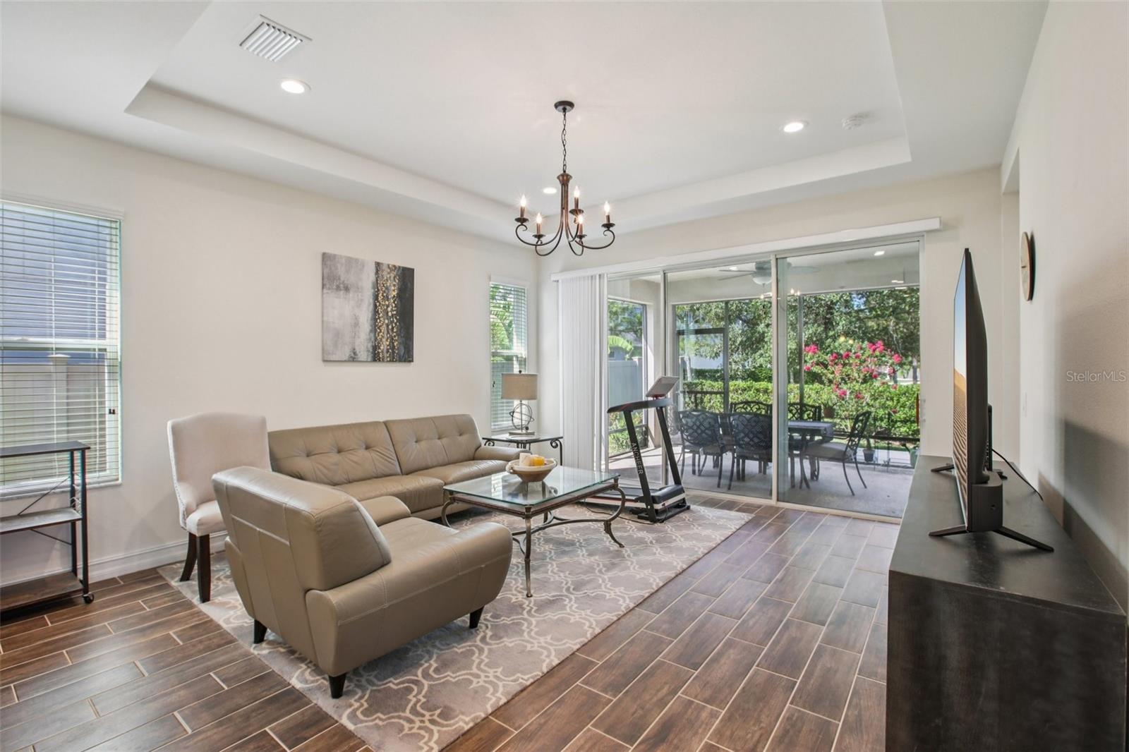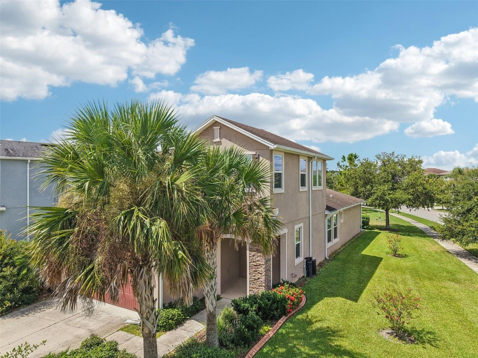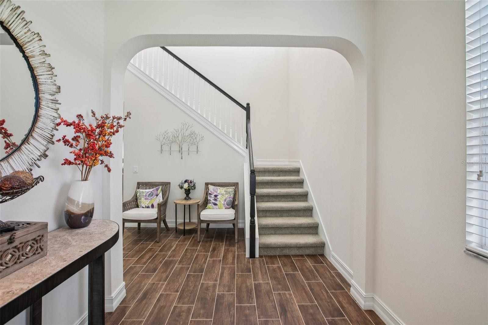 One or more photo(s) has been virtually staged. Welcome home to this beautiful corner-lot residence in the sought-after Estancia at Wiregrass community of Wesley Chapel, offering no rear neighbors. From the moment you step into the grand foyer with soaring ceilings and a dramatic staircase, you’ll notice the thoughtful upgrades, including wood-look porcelain tile throughout the main level. The first floor features a private den or home office, a spacious great room with a tray ceiling, a formal dining area, a convenient powder bath, and a chef’s kitchen with a large center island, stainless steel appliances, a gas range, quartz countertops, recessed lighting, and 42" upper cabinets with crown detail. The main-level primary suite offers a spa-style bath with dual vanities, a walk-in shower, and a designer walk-in closet. Upstairs, a generous loft provides flexible living space, along with two sizable bedrooms and a full bath. Additional comforts include a water softener and a tankless water heater.