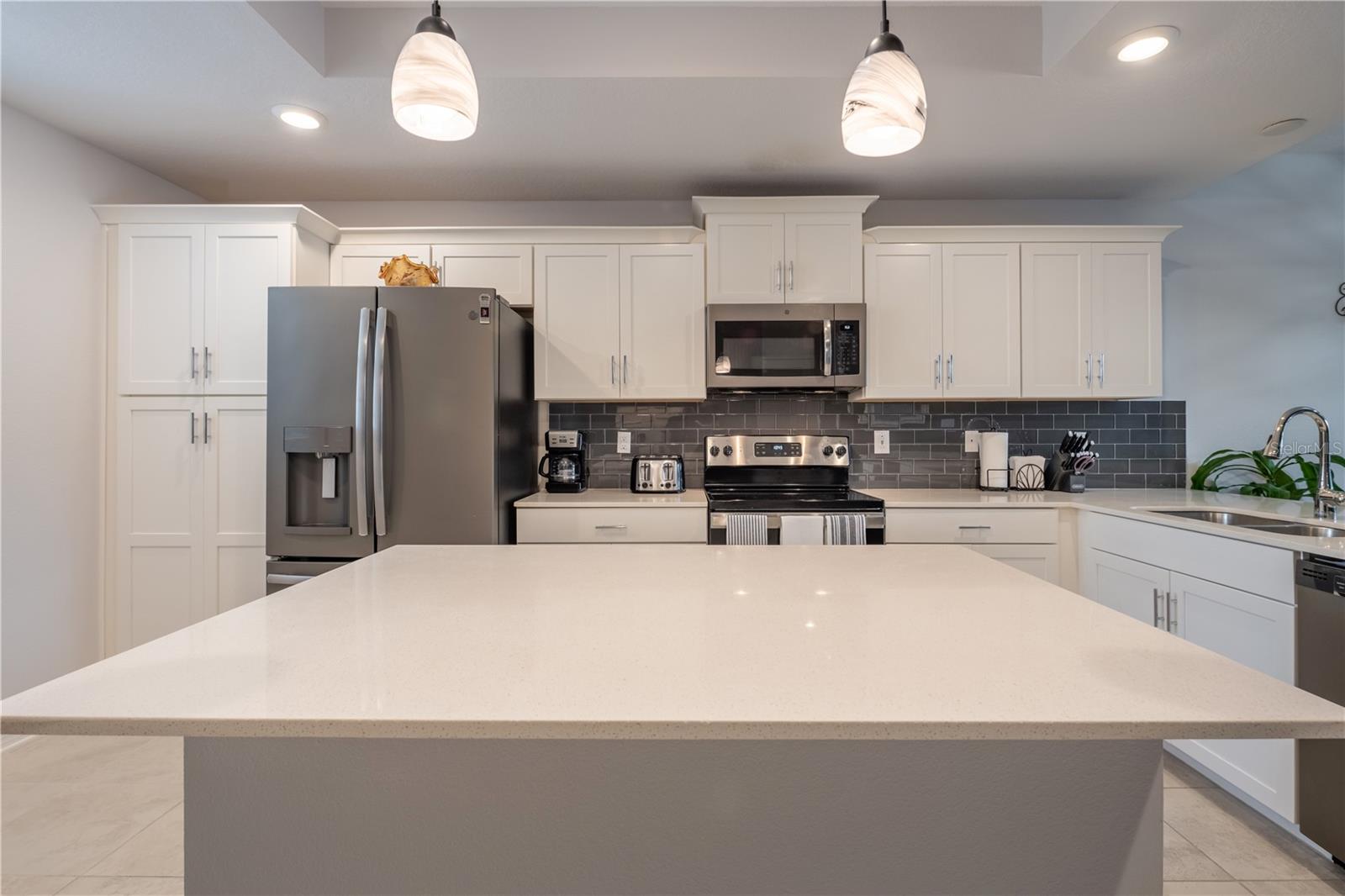 Welcome to this beautifully updated 2-bedroom, 2-bath condo in the Terraces at Storey Lake, offering low-maintenance living in one of Central Florida’s premier resort communities. This bright, open floor plan features a modern kitchen with white shaker cabinetry, quartz countertops, a large center island, stainless steel appliances, and a charcoal subway tile backsplash. Ceramic tile flooring extends through the main living areas, with vinyl flooring in both bedrooms—no carpet. The spacious primary suite includes a tray ceiling, a designer accent wall, and an ensuite bath with a double-sink quartz vanity and a large walk-in shower. The second bedroom enjoys its own nearby full bath with a double-sink vanity and tub/shower combo. The living and dining areas open to a private balcony with peaceful greenery views. Storey Lake offers a full resort experience with a heated pool, lazy river, water slides, splash pad, mini golf, a fitness center, sports courts, canoe and kayak rentals, dog parks, quiet pools, playgrounds, and 24-hour gated entry. Ideally located minutes from Disney, Lake Buena Vista, Disney Springs, The Loop, shopping, dining, and Orlando International Airport.