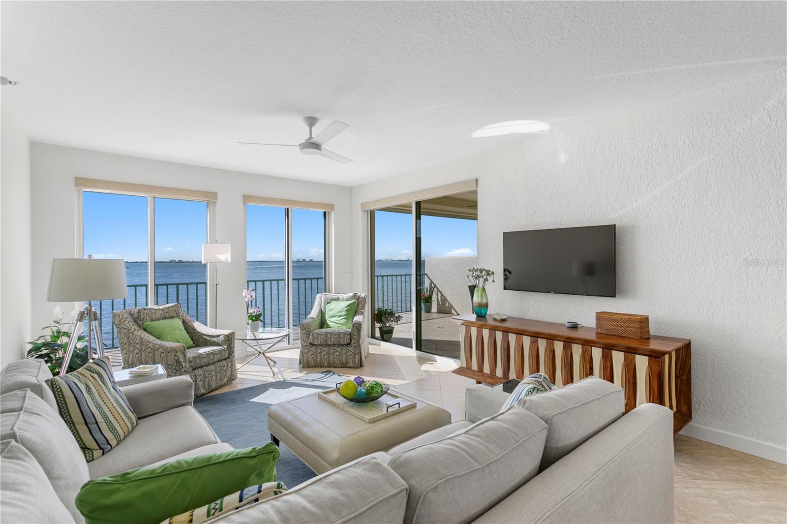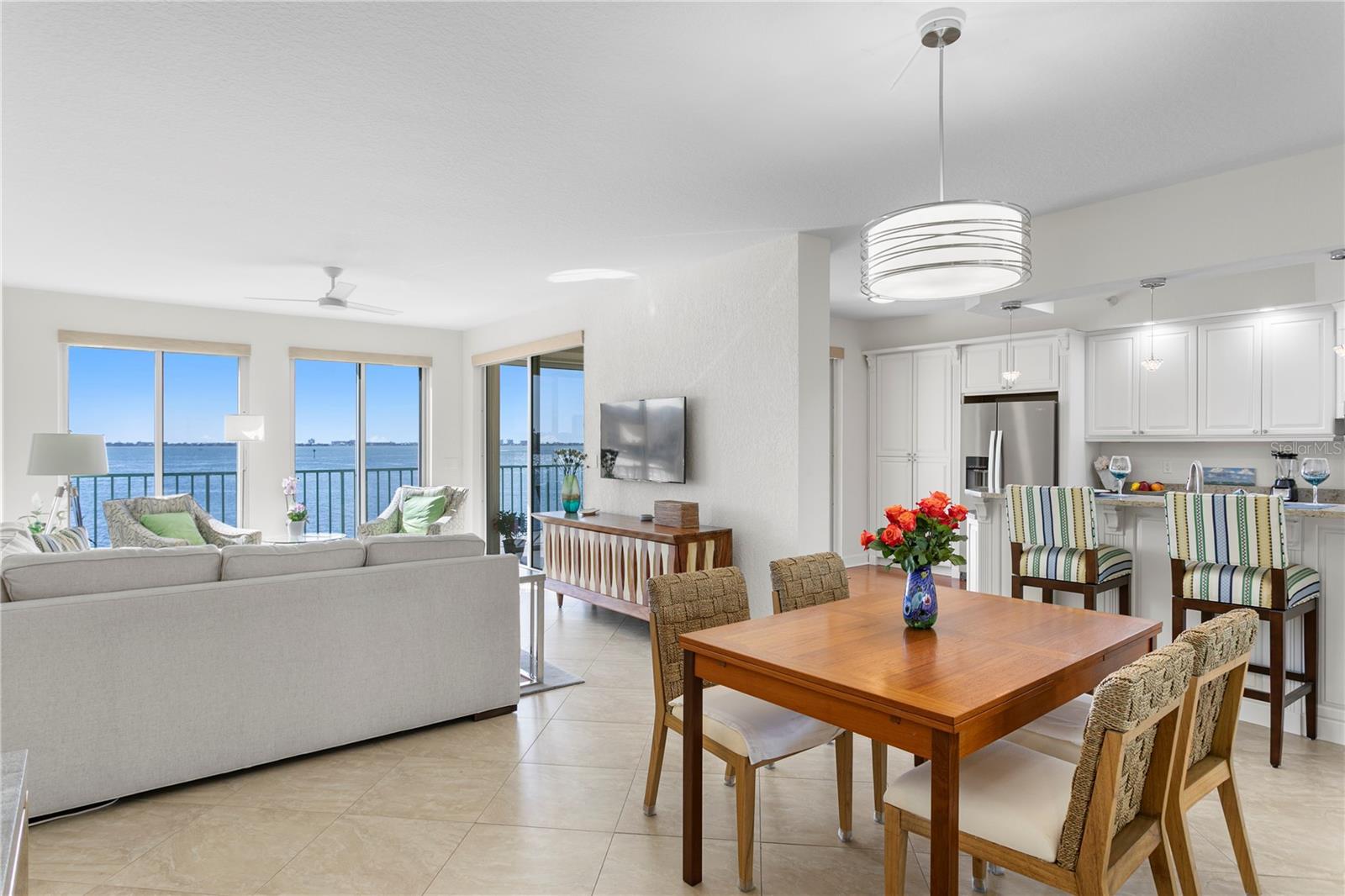 Inside, natural light floods the open-concept living and dining areas through a wall of 8-foot sliding glass doors, framing breathtaking bay views and creating a bright, inviting ambiance. The updated kitchen blends function and style with ample cabinetry, generous counter space, and a convenient breakfast bar ideal for casual entertaining.