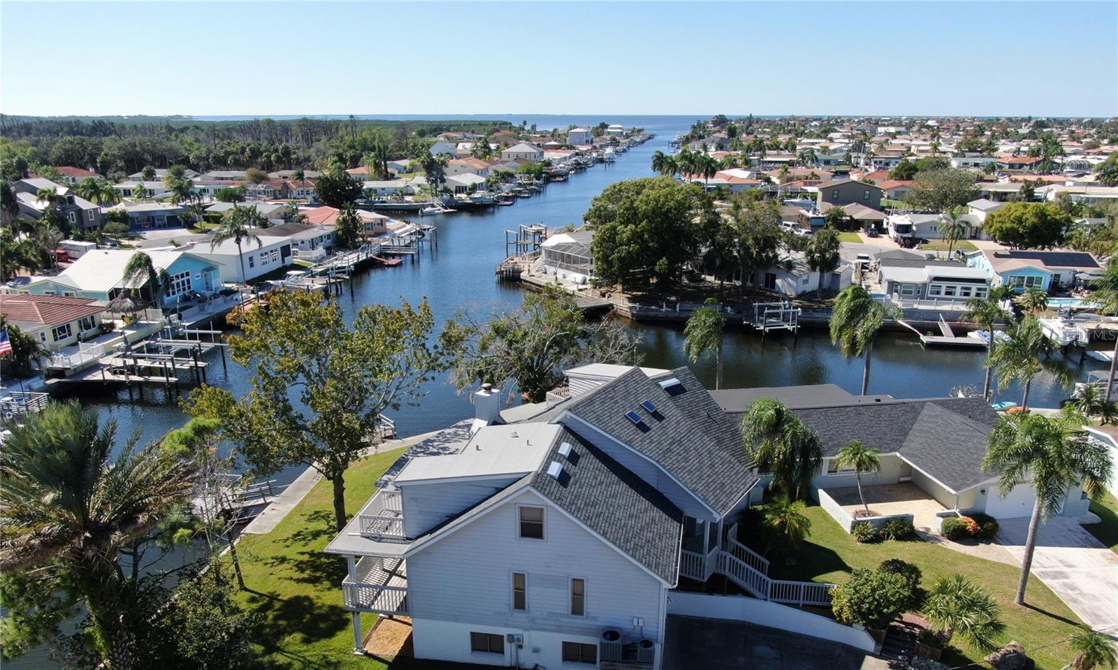 This Key West style Elevated home did not flood during hurricane Helene. It boasts 131’ of seawall frontage on the deep South Channel with direct access to the gulf. The first floor has 1 bedroom, 1 full and 1 half bath, a large office/den, eat-in kitchen with breakfast bar and a dining room. The large living room is open to the second story ceiling and has a wood-burning fireplace for cool evenings. Sliders from the living room open to a covered deck spanning the entire length of the back of the home. The second floor has 2 bedrooms each with their own open decks facing the water. The bedrooms are connected by a loft that also serves as an office, or library and overlooks the living room below. There is 1 full bathroom on the second floor. The combination of high wooden ceilings with four skylights creates an open casual feeling to the home. The roof was replaced in 2024. The garage is set up for the boater with garage doors on the front and back of garage for easy access to boating equipment. The unfinished basement is perfect for storage, or for that wine cellar you dreamed of. Gulf Harbors is a golf cart friendly community. There is an optional community HOA that hosts activities and clubs throughout the year and a members-only private community beach with unforgettable sunsets. If you are looking for the Florida Lifestyle, look no further!