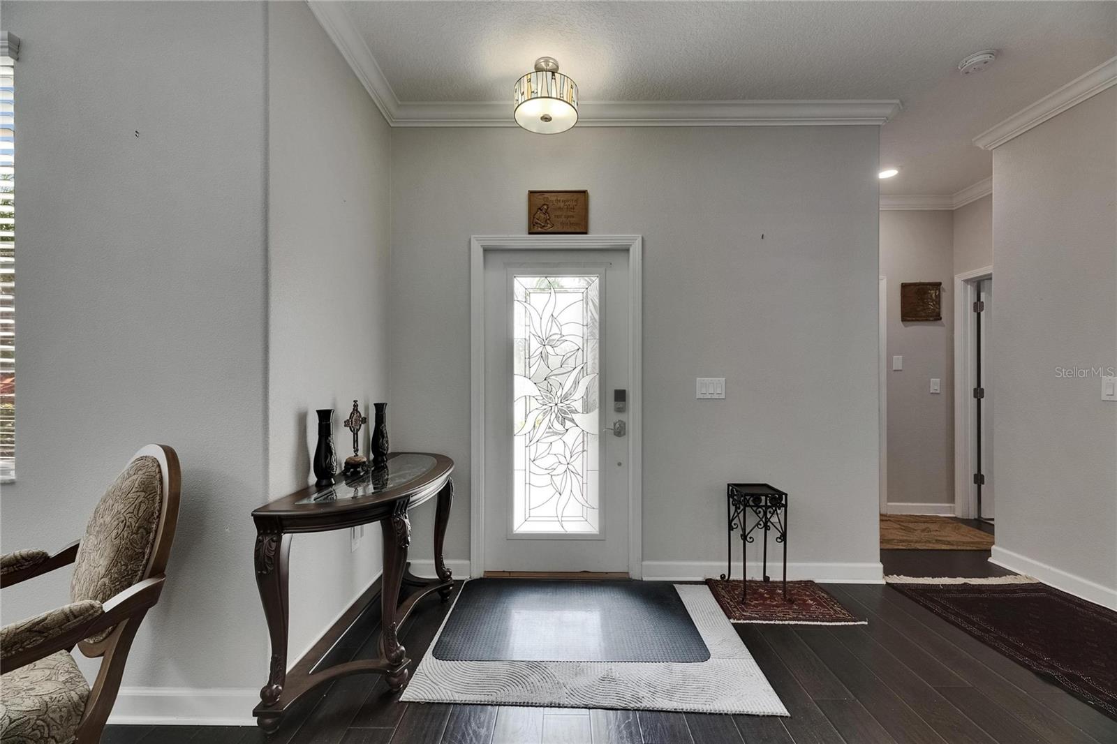 This beautifully maintained home features outstanding curb appeal with a three-car side-load garage, etched concrete driveway, and lush landscaping. Inside, a two-story open foyer with a grand wood staircase welcomes you into formal living and dining rooms adorned with rich wood floors and stylish fixtures. Natural sunlight radiates throughout the home, enhancing the warmth and elegance of every space.