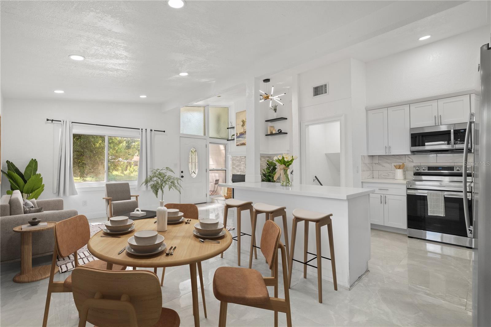 One or more photo(s) has been virtually staged. **NEW PRICE on this MOVE-IN READY 4 Bedroom/3 Bathroom St. Pete Home!** Exceptionally renovated and ideally located in the heart of St. Pete, you will love having no HOA, no flood zone, and a deep 100ft lot that gives you all the freedom you need to make it your own! Stepping into the living room you’ll love the soaring ceilings, beautiful marble-inspired tile, accent fireplace, and open floor plan. The kitchen features white shaker cabinets, stainless steel appliances, beautiful quartz countertops, and a large entertaining island for casual eating. Its ideal split floor plan has the master bedroom downstairs with its own massive en-suite bathroom and the three additional guest bedrooms and two guest bathrooms upstairs. All bathrooms have been consistently updated for an elevated modern aesthetic, while still maintaining charming character. The backyard has a new EXPANSIVE wooden deck with a custom built-in pergola, paver patio below, and green space for the little ones and pets. Additional upgrades include a 2021 metal roof, 2022 AC, and a 2022 hot water heater. You will love living minutes to all that 4th St N has to offer in terms of your daily conveniences, restaurants, and shopping. Not to mention also being 8 minutes to downtown St. Pete, 24 minutes to the best beaches in the country, and only 16 minutes to Tampa International Airport! If you’ve been searching for that elusive 4 bedroom home that doesn’t need $100k to renovate it, do not miss out on this one!