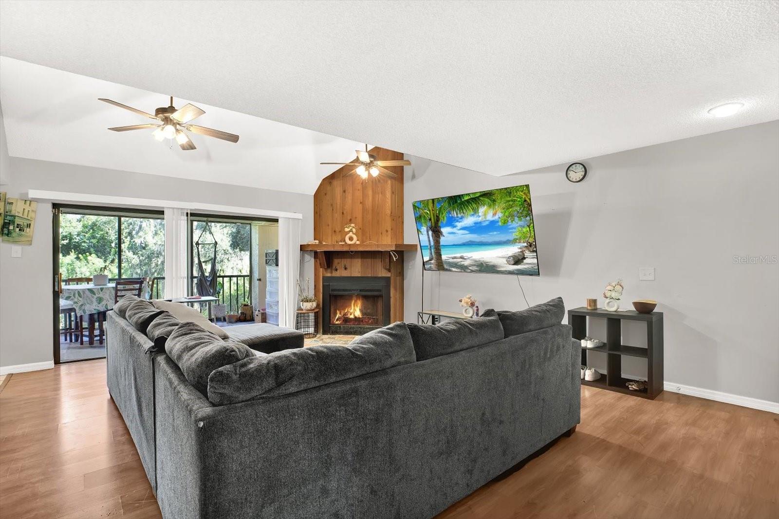 This beautifully updated two-story condo offers 1,757 sq. ft. of open and comfortable living space, featuring sleek laminate flooring throughout. The living room is bright and airy with soaring ceilings, dual ceiling fans, and a cozy fireplace perfect for relaxing or entertaining guests. The spacious eat-in kitchen has plenty of cabinet space plus a newly added pantry for extra storage. Step out onto the oversized screened-in balcony where you’ll enjoy peaceful conservation views and a peek at the water plus there’s even an exterior storage closet for added convenience.