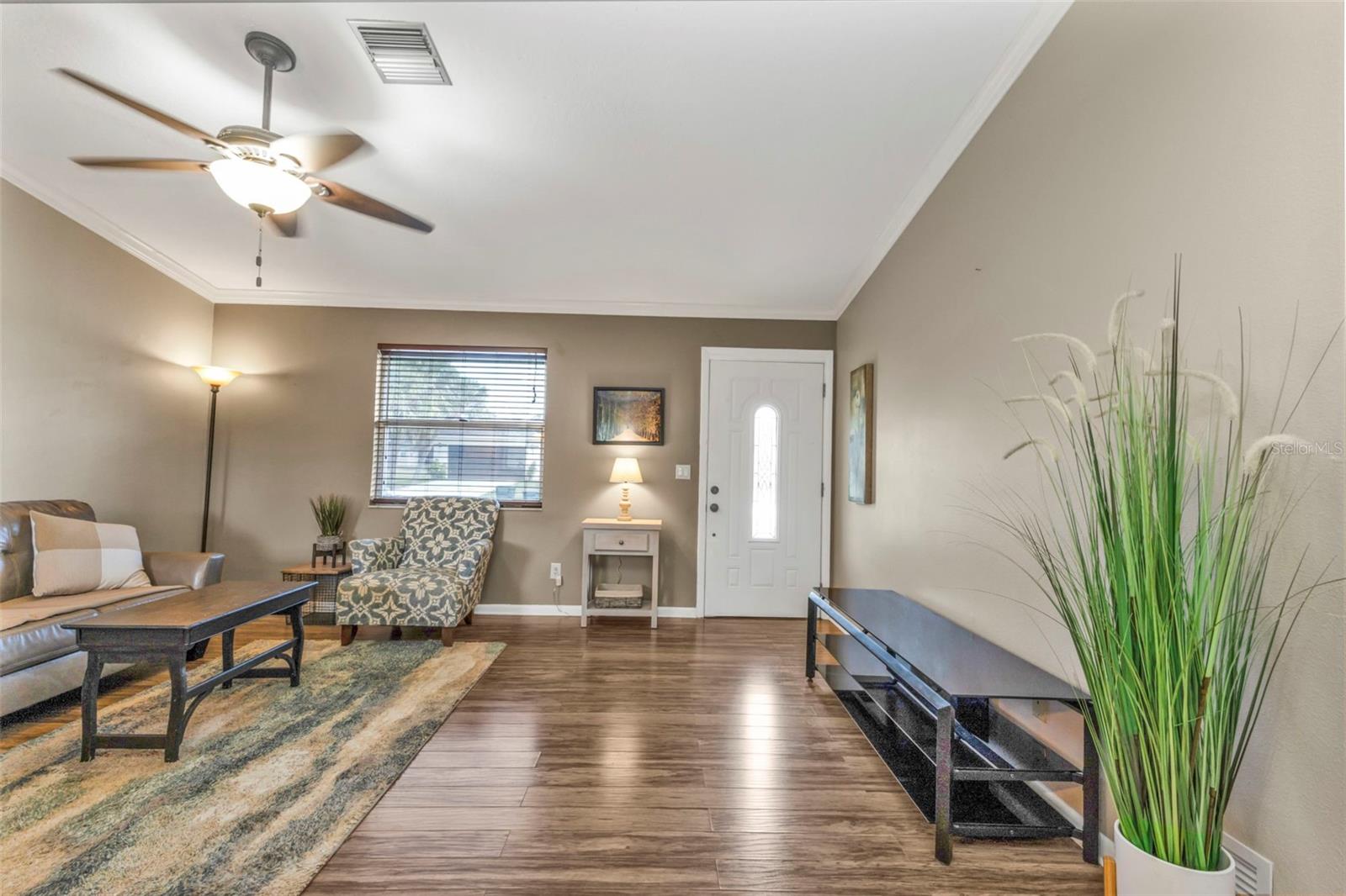 The home is finished with wood-look laminate flooring for a sleek, modern feel. The upgraded bathroom offers a touch of luxury with a solid surface countertop, wood vanity with makeup counter, beautifully tiled walk-in shower, updated plumbing and lighting fixtures, and a new commode.