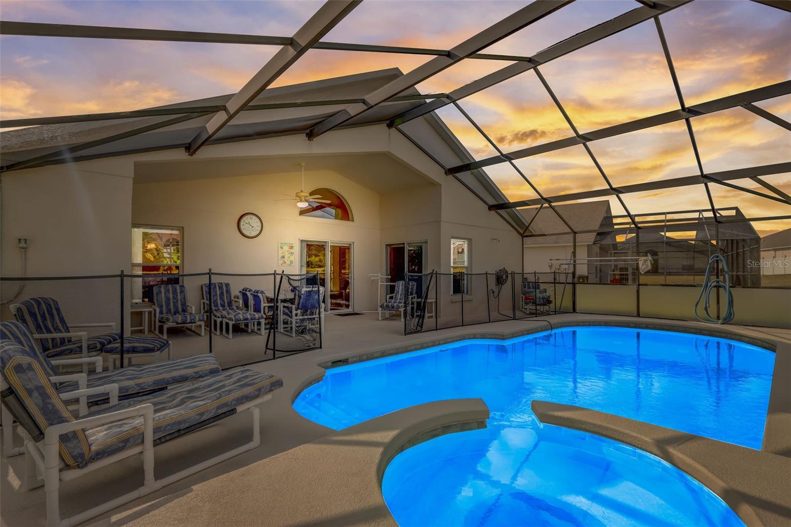 The garage has been converted into a game room, adding extra space for fun and entertainment. Step outside to your private backyard oasis with a screened-in heated pool and spa, outdoor shower, and a generous pool deck ideal for lounging or hosting gatherings. The home backs onto open green space, providing added privacy and a tranquil view.