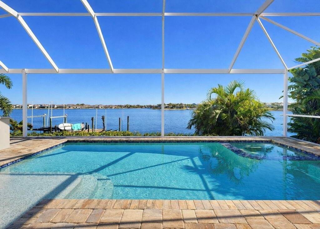 Enjoy the BEST VIEWS IN MIRABAY with access to Tampa Bay! This 1 story Mangrove Floor plan by David Weekley has it all. The exterior features a gorgeous pool, hot tub and outdoor kitchen overlooking the lagoon, a dock and 10,000 lb. boat lift! The interior features 4 bedrooms plus a den/guestroom/office, 3 full bathrooms plus one half bathroom, and a 2 car garage. With approximately 3000 sf, this home has many upgrades including 42 inch cherry cabinets, stainless steel appliances, a large kitchen with quartz counters, TONS of windows to enjoy the panoramic views of the lagoon, plantation shutters, expansive outdoor lanai, plus a large backyard with an outdoor seating/fire pit area. The beautiful oversized master bedroom features bamboo floors, a sitting area overlooking the water and a stunning master bathroom complete with extra large shower and a 3 person sauna! Features include: