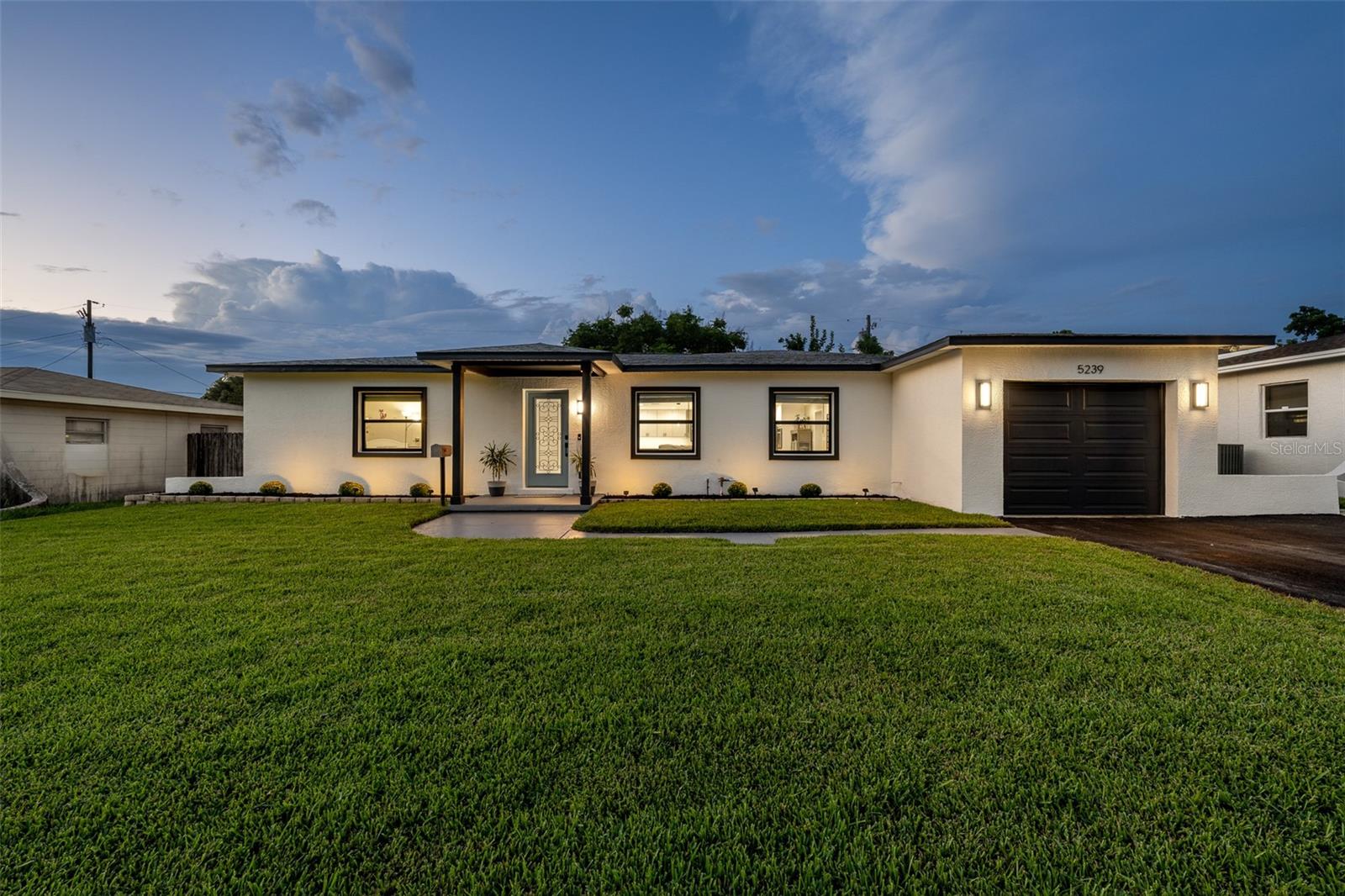 The exterior reflects the best of classic mid-century modern design, blending clean lines with understated elegance. A crisp white façade, bold black trim, and a striking front door elevate curb appeal, while thoughtful lighting transforms the home at night, casting a warm, sophisticated glow. A covered front porch adds charm and creates a stylish, welcoming entry.