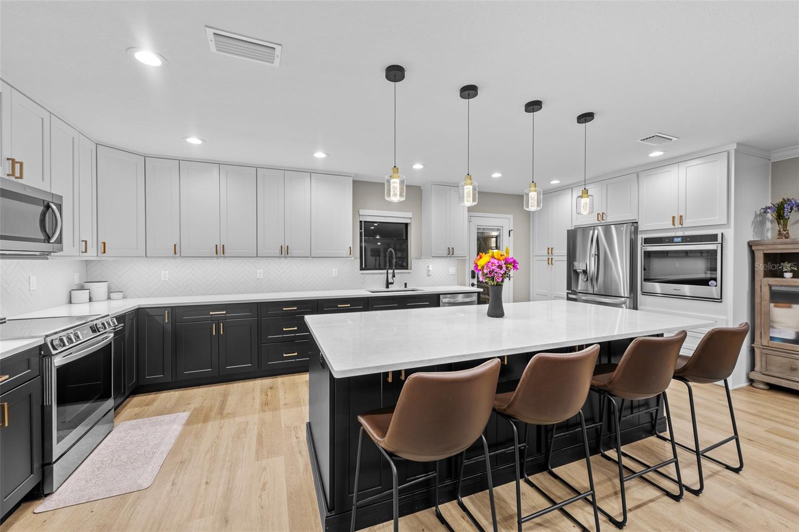 This fully reimagined mid-century modern ranch combines timeless architecture with today’s most sought-after upgrades. The floor plan has been completely reconfigured to create a seamless open-concept layout, with the massive, showpiece kitchen serving as the heart of the home. To achieve this design, extensive structural work was completed, including a structural LVL beam and 3-ply roof girder, allowing the main living room to fully open into the kitchen. Unlike many remodels with awkward steps or transitions, every detail here was professionally engineered, permitted through the City of St. Petersburg, and executed by licensed contractors, resulting in a layout that feels both intentional and timeless.