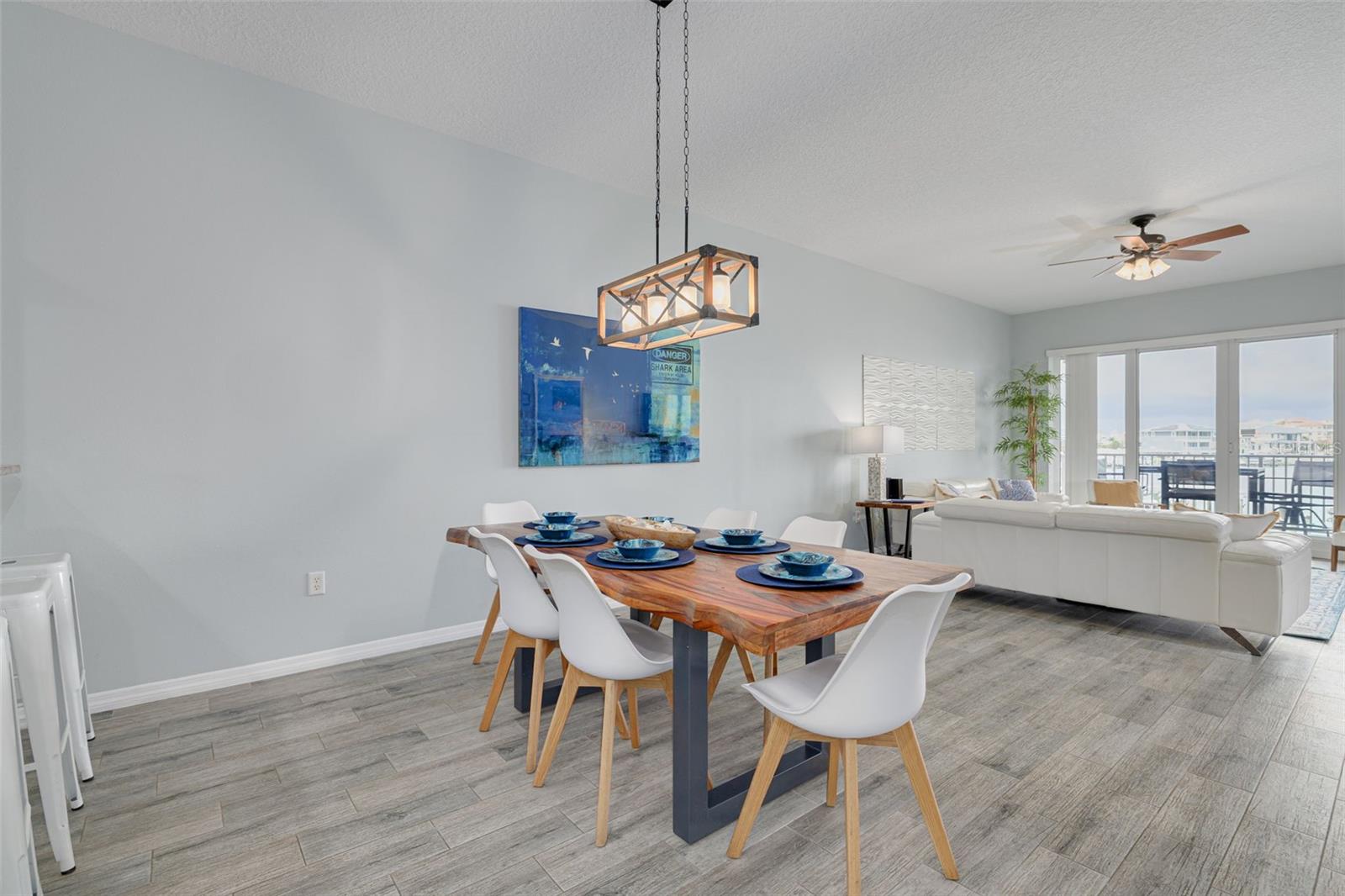 The spacious great room is a showstopper, featuring gorgeous newer plank-style tiles, light and airy beach-inspired hues, and a decorative fireplace that adds a touch of warmth and ambiance. This space is designed for both relaxation and entertaining.