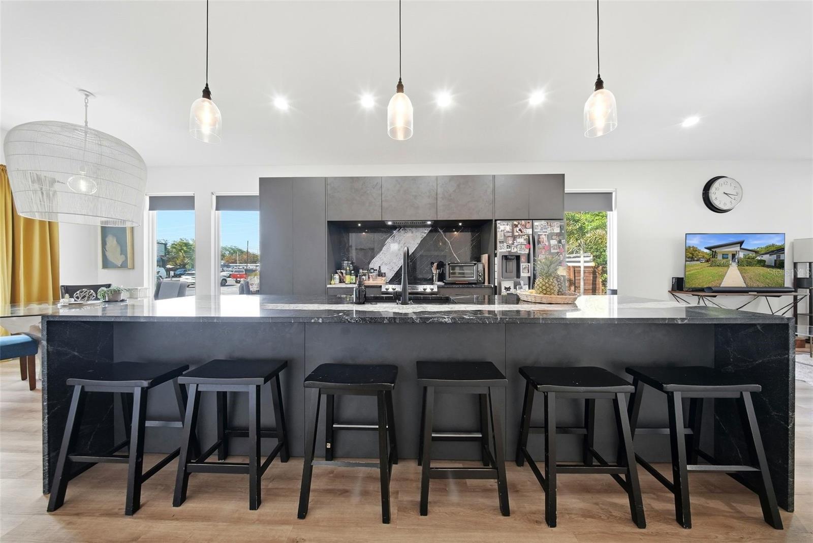 Natural light fills the home, highlighting the clean architectural lines and contemporary finishes. The open living, dining, and kitchen spaces flow together seamlessly, creating an inviting atmosphere perfect for everyday living or entertaining guests. Vinyl flooring and ceiling fans throughout enhance both comfort and style.