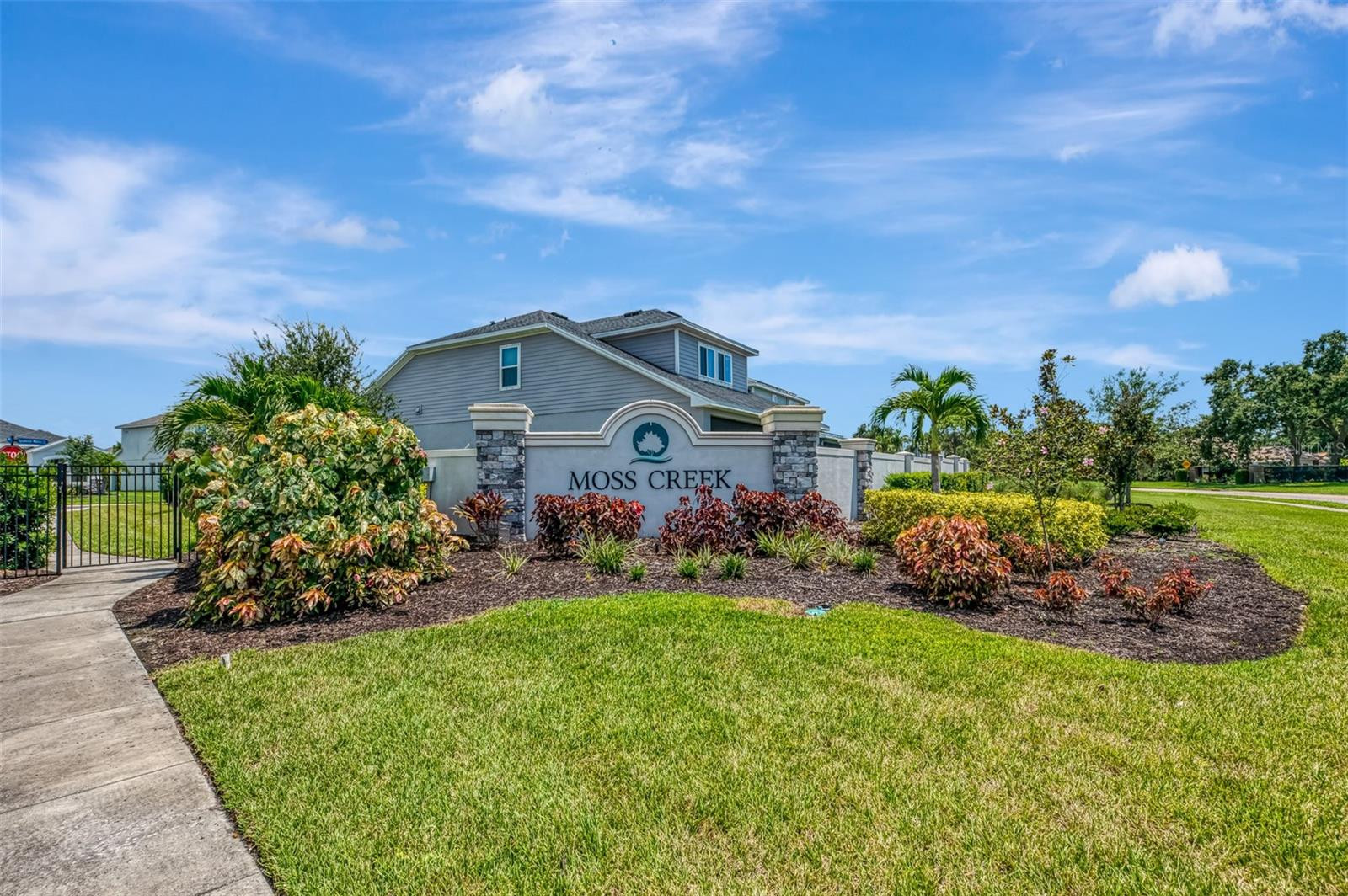 PRICE IMPROVEMENT -- SELLERS ARE MOTIVATED!! Welcome to one of the largest homesites in Moss Creek—an oversized corner lot with serene water views and rare HOA-approved full-yard fencing and play gym already in place. This spacious two-story David Weekley Homes Alstonia model offers 4 bedrooms plus a den, 2.5 baths, and a host of thoughtful upgrades designed for comfort and style. Step inside to find no carpet on the first floor—just durable, scratch- and water-resistant luxury vinyl plank flooring that flows seamlessly through the main living areas. The first-floor living room and primary suite both enjoy peaceful water views, while the bathrooms feature tiled showers that extend to the ceiling for a clean, modern finish. The kitchen is a true centerpiece, with sleek quartz countertops, Whirlpool appliances, and a layout that invites both cooking and conversation. Outside, enjoy Florida living at its finest with a screened-in lanai, uncovered paver patio, covered front entry, and a fully irrigated, beautifully landscaped yard. Unlike most homes in the community, this property includes gutters and a full smart home system with integrated lighting and perimeter security. Auto-on lights in the garage and half bath add convenience, while the triple-lite UV HVAC system ensures purified air throughout the home. The garage is a standout feature, with paint chip epoxy floors, overhead storage, a Fast Track system with attachments, and a 50 AMP hook-up for added versatility. Inside, you'll find a custom primary closet, laundry shelving, and two HOA-approved sheds—plus a playset ready for fun. As a bonus, the survey and title insurance are included at no additional cost at closing, offering peace of mind and real savings. Residents of Moss Creek enjoy access to a community pool, perfect for relaxing weekends and neighborhood gatherings. And with nearby public golf courses, grocery stores, restaurants, Sam’s Club, University Town Center, and world-class Gulf beaches, this home delivers the perfect blend of comfort, convenience, and lifestyle in one of Bradenton’s most desirable communities.